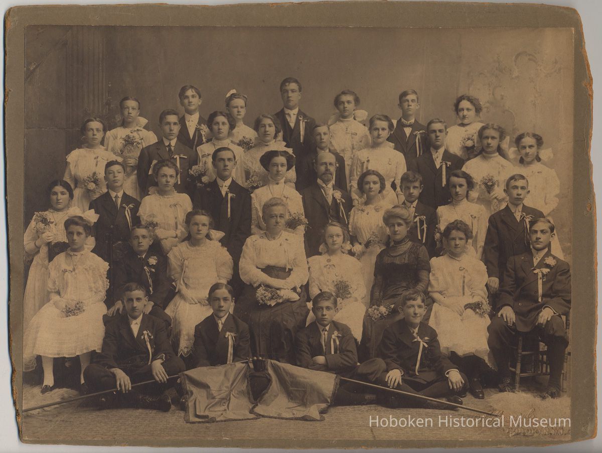At the bottom are two pennants, embroidered "No. 1." The children seem to range in ages over several years. Event is not known: possibly a graduation photo related to School No. 1 or related to a church or cultural association. One or more persons may be related to the J. Widmann family of Hoboken. See notes.