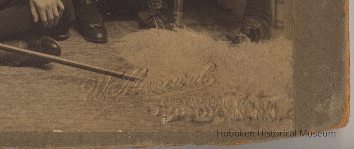 Print 7" high x 9-5/16" wide on trimmed mount. Photographer's blind emboss on print at bottom right: W. Manewal, 520 Washington St., Hoboken, N.J. Reverse is blank.