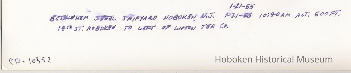 On reverse: CP-10352 in black ballpoint ink; text with marking pen, Bethlehem Steel Shipyard, Hoboken, N.J., 1-21-55, 10:40 AM, Alt. 500 ft, 14th St. Hoboken to Left of Lipton Tea Co.