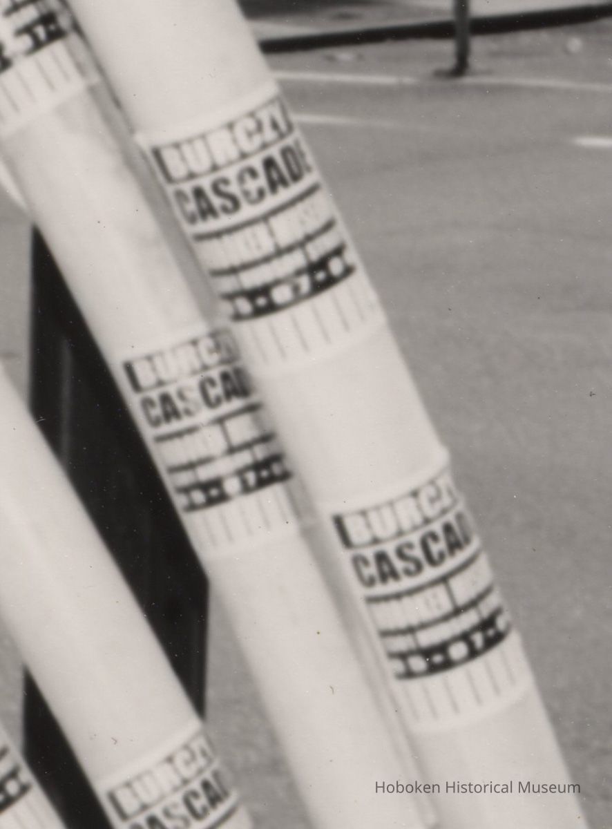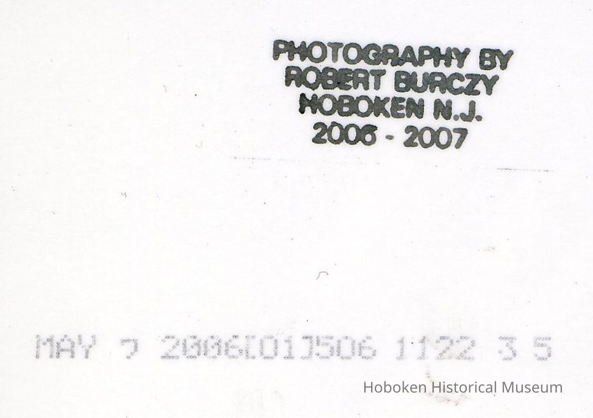 The view is southeast. The multiple stickers applied to the plastic tubes are reduced size versions of a what are called "Burczy's" which was typically an 8-1/2" x 11" poster. The stickers in the same black-and-white format were for Cascade: Proving His Mettle. The Poster Art of Robert Burczy which promoted his exhibition at the Hoboken Historical Museum and opened on May 7, 2006. The use of stickers was a new format for the artist.