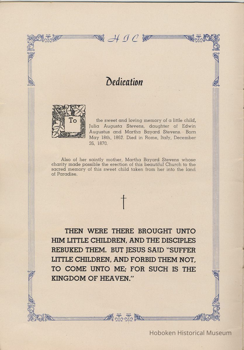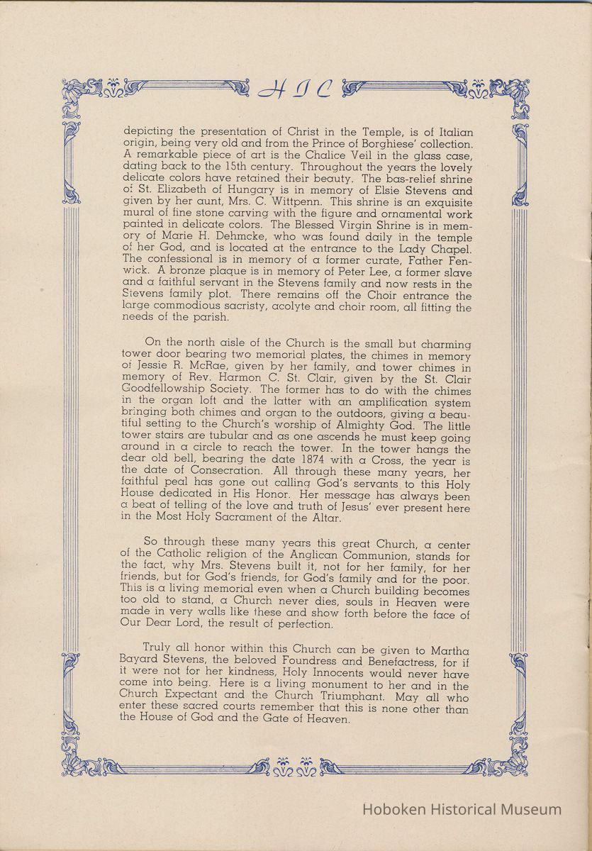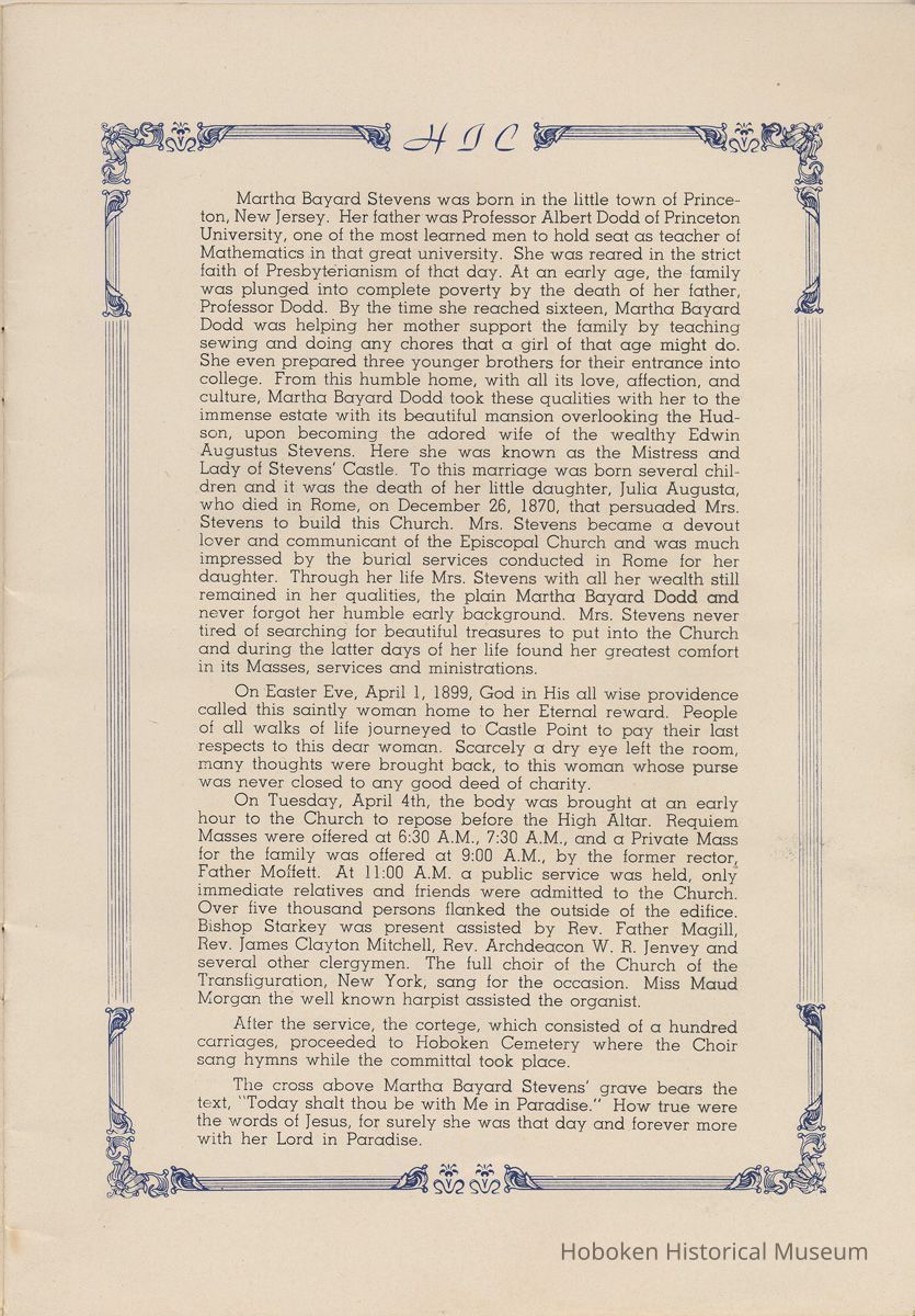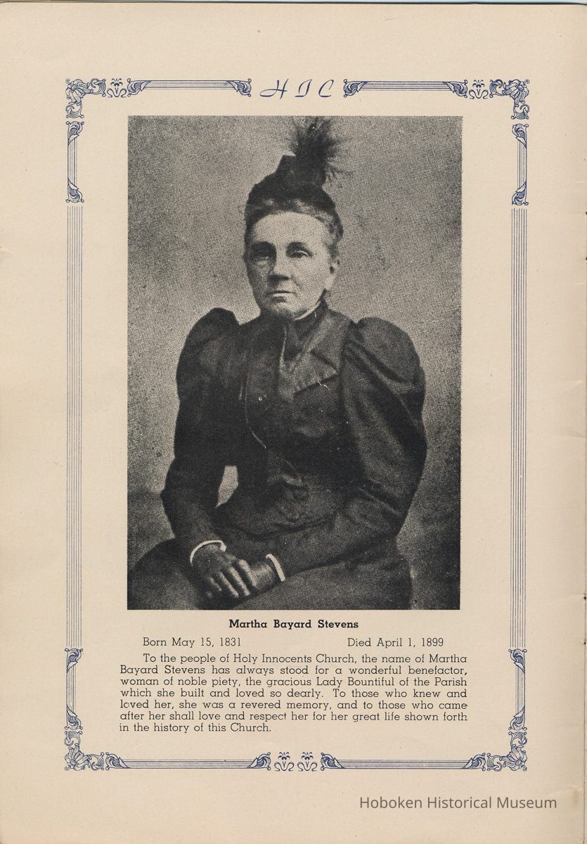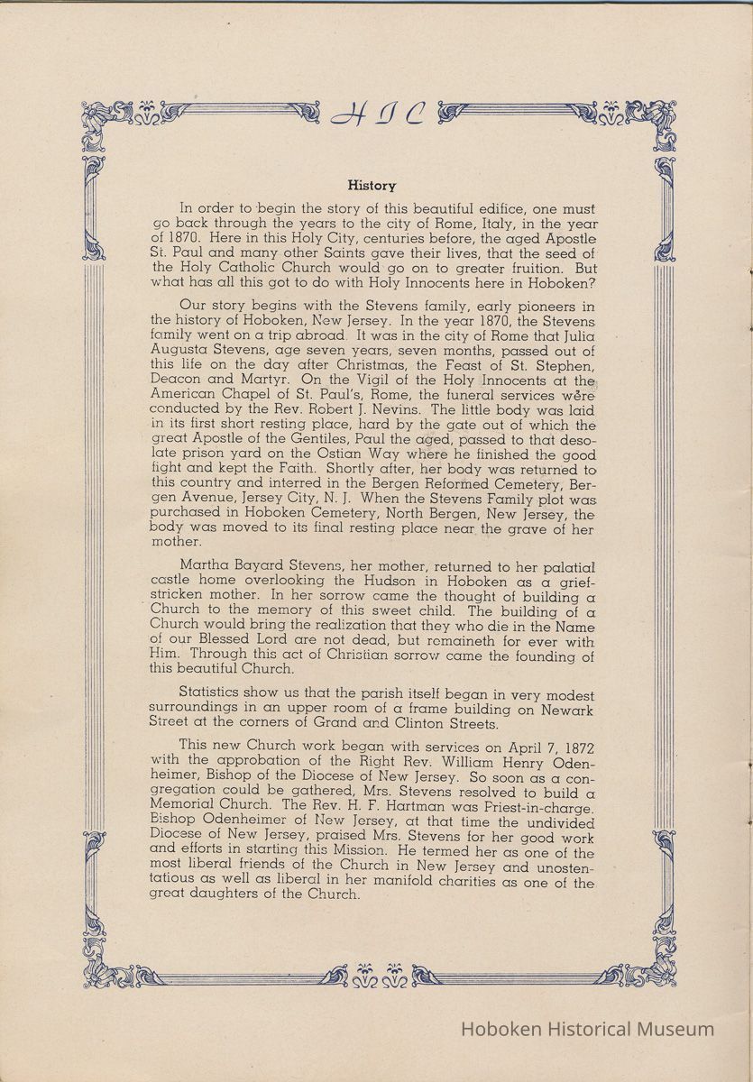 Notes: Transcription of main text in booklet 2009.017.0006: Church of the Holy Innocents. The Miniature Cathedral, Hoboken, New Jersey. Holy Innocents' Day, 1947, 75th Anniversary of Founding. By John J. Heaney, Sacristan. page [2] Dedication To the sweet and loving memory of a little child, Julia Augusta Stevens, daughter of Edwin Augustus and Martha Bayard Stevens. Born May 18th,1862. Died in Rome, Italy, December 26, 1870. Also of her saintly mother, Martha Bayard Stevens whose charity made possible the erection of this beautiful Church to the sacred memory of this sweet child taken from her into the land of Paradise. THEN WERE THERE BROUGHT UNTO HIM LITTLE CHILDREN, AND THE DISCIPLES REBUKED THEM. BUT JESUS SAID "SUFFER LITTLE CHILDREN, AND FORBID THEM NOT, TO COME UNTO ME; FOR SUCH IS THE KINGDOM OF HEAVEN." page [5]: [beneath photo of Martha Bayard Stevens] Martha Bayard Stevens Born May 15, 1831 Died April 1, 1899 To the people of Holy Innocents Church, the name of Martha Bayard Stevens has always stood for a wonderful benefactor, woman of noble piety, the gracious Lady Bountiful of the Parish which she built and loved so dearly. To those who knew and loved her, she was a revered memory, and to those who came after her shall love and respect her for her great life shown forth in the history of this Church. pg [6]: [biography / obituary of Martha Bayard Dodd Stevens] Martha Bayard Stevens was born in the little town of Princeton, New Jersey. Her father was Professor Albert Dodd of Princeton University, one of the most learned men to hold seat as teacher of Mathematics in that great university. She was reared in the strict faith of Presbyterianism of that day. At an early age, the family was plunged into complete poverty by the death of her father, Professor Dodd. By the time she reached sixteen, Martha Bayard Dodd was helping her mother support the family by teaching sewing and doing any chores that a girl of that age might do. She even prepared three younger brothers for their entrance into college. From this humble home, with all its love, affection, and culture, Martha Bayard Dodd took these qualities with her to the immense estate with its beautiful mansion overlooking the Hudson, upon becoming the adored wife of the wealthy Edwin Augustus Stevens. Here she was known as the Mistress and Lady of Stevens' Castle. To this marriage was born several children and it was the death of her little daughter, Julia Augusta, who died in Rome, on December 26, 1870, that persuaded Mrs. Stevens to build this Church. Mrs. Stevens became a devout lover and communicant of the Episcopal Church and was much impressed by the burial services conducted in Rome for her daughter. Through her life Mrs. Stevens with all her wealth still remained in her qualities, the plain Martha Bayard Dodd and never forgot her humble early background. Mrs. Stevens never tired of searching for beautiful treasures to put into the Church and during the latter days of her life found her greatest comfort in its Masses, services and ministrations. On Easter Eve, April 1, 1899, God in His all wise providence called this saintly woman home to her Eternal reward. People of all walks of life journeyed to Castle Point to pay their last respects to this dear woman. Scarcely a dry eye left the room, many thoughts were brought back, to this woman whose purse was never closed to any good deed of charity. On Tuesday, April 4th, the body was brought at an early hour to the Church to repose before the High Altar. Requiem Masses were offered at 6:30 AM., 7:30 A.M., and a Private Mass for the family was offered at 9:00 A.M., by the former rector, Father Moffett. At 11:00 A.M. a public service was held, only immediate relatives and friends were admitted to the Church. Over five thousand persons flanked the outside of the edifice. Bishop Starkey was present assisted by Rev. Father Magill, Rev. James Clayton Mitchell, Rev. Archdeacon W. R. Jenvey and several other clergymen. The full choir of the Church of the Transfiguration, New York, sang for the occasion. Miss Maud Morgan the well known harpist assisted the organist. After the service, the cortege, which consisted of a hundred carriages, proceeded to Hoboken Cemetery where the Choir sang hymns while the committal took place. The cross above Martha Bayard Stevens' grave bears the text, "Today shalt thou be with Me in Paradise." How true were the words of Jesus, for surely she was that day and forever more with her Lord in Paradise pg [7] 'A LITTLE CHILD SHALL LEAD THEM' Introduction The pages of this book and many like them could never tell the complete story of this Church. The story, with every detail since her conception, can only be told by God alone. This book, in brief, will give some of the historical facts with a description of the Church. Much of this information is taken from old records of the parish and writings of Father Alfred G. Mortimer of Philadelphia, Father George Ernest Magill, former rector of Holy Innocents' and the present rector, Father Edward P. Hooper. In writing this book, a very striking fact has been taken from the old records, that this Church had her beginning in an upper room of a frame building. This thought should take us back to another upper room where our Blessed Lord was present and gave us the Holy Sacrament of the Altar. So Holy Innocents Church, since her beginning in that upper room follows her Lord's command. Sunday, Holy Days, day after day, year in and year out, the priest goes to the Altar to celebrate the Holy Sacrifice of the Mass that. "He might dwell in us and we in Him." With this foundation that this Church is built upon, we, on this seventy-fifth anniversary, can look upon her glory of the past that our present lives may be made worthy to follow such a holy pattern as those who have gone before have made for us. May our good deeds and our lives make this parish Church, a great Church, for those who follow after us, and for the greater Gl