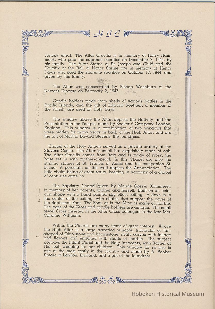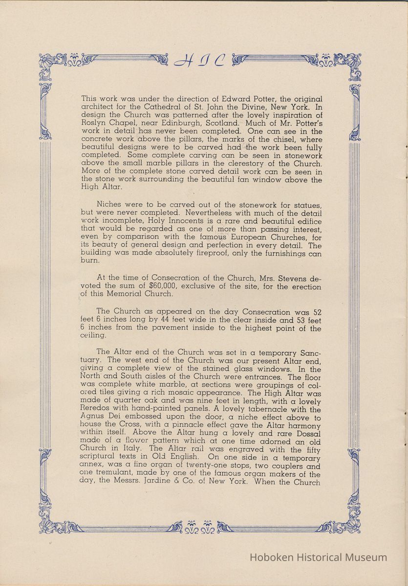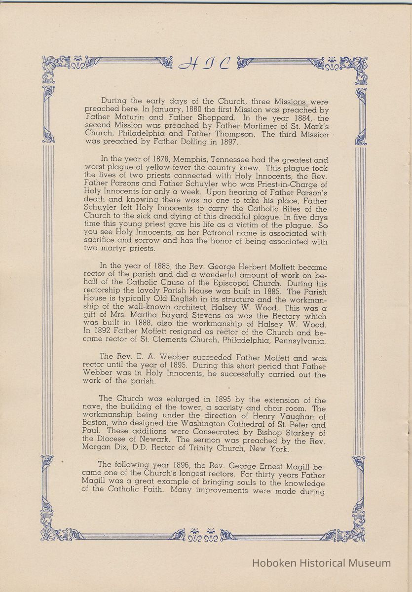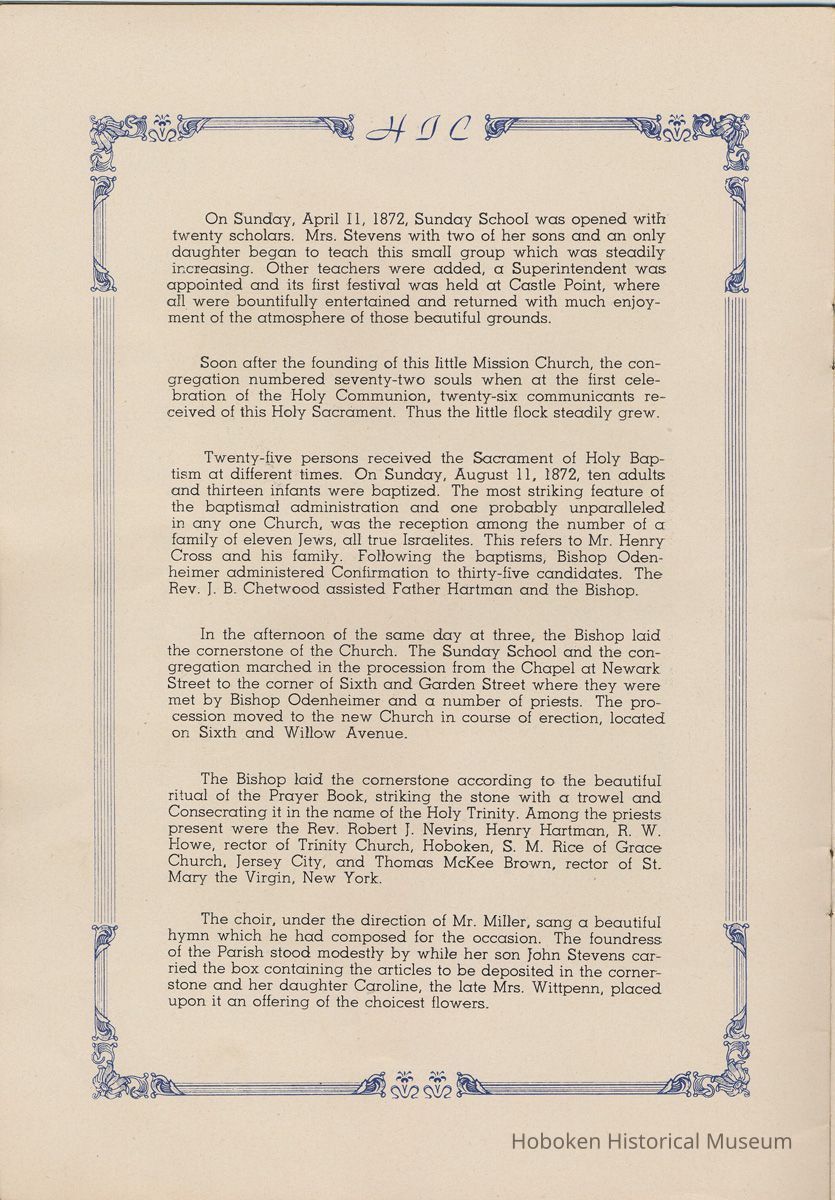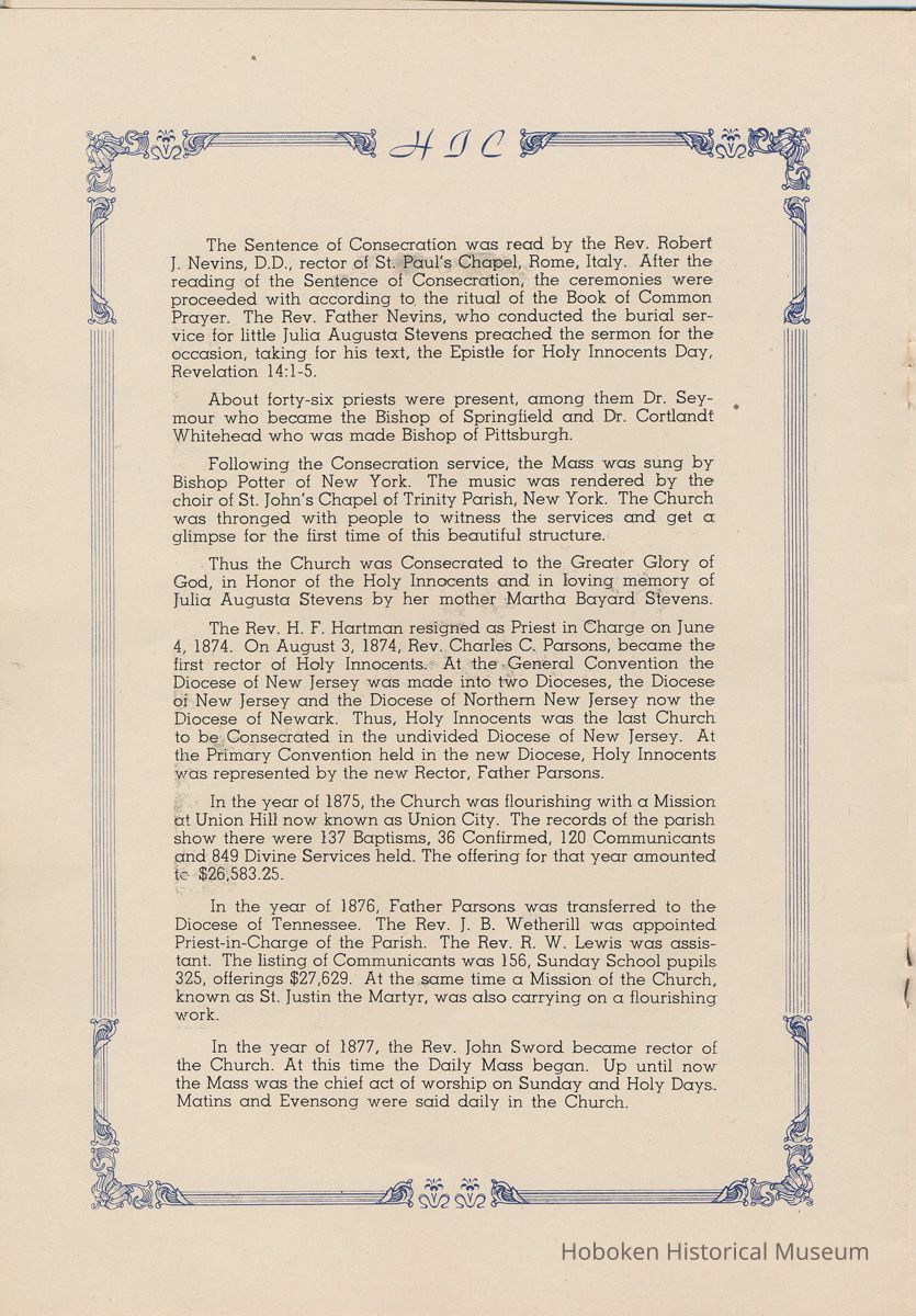 Notes: Transcription of main text in booklet 2009.017.0006: Church of the Holy Innocents. The Miniature Cathedral, Hoboken, New Jersey. Holy Innocents' Day, 1947, 75th Anniversary of Founding. By John J. Heaney, Sacristan. page [2] Dedication To the sweet and loving memory of a little child, Julia Augusta Stevens, daughter of Edwin Augustus and Martha Bayard Stevens. Born May 18th,1862. Died in Rome, Italy, December 26, 1870. Also of her saintly mother, Martha Bayard Stevens whose charity made possible the erection of this beautiful Church to the sacred memory of this sweet child taken from her into the land of Paradise. THEN WERE THERE BROUGHT UNTO HIM LITTLE CHILDREN, AND THE DISCIPLES REBUKED THEM. BUT JESUS SAID "SUFFER LITTLE CHILDREN, AND FORBID THEM NOT, TO COME UNTO ME; FOR SUCH IS THE KINGDOM OF HEAVEN." page [5]: [beneath photo of Martha Bayard Stevens] Martha Bayard Stevens Born May 15, 1831 Died April 1, 1899 To the people of Holy Innocents Church, the name of Martha Bayard Stevens has always stood for a wonderful benefactor, woman of noble piety, the gracious Lady Bountiful of the Parish which she built and loved so dearly. To those who knew and loved her, she was a revered memory, and to those who came after her shall love and respect her for her great life shown forth in the history of this Church. pg [6]: [biography / obituary of Martha Bayard Dodd Stevens] Martha Bayard Stevens was born in the little town of Princeton, New Jersey. Her father was Professor Albert Dodd of Princeton University, one of the most learned men to hold seat as teacher of Mathematics in that great university. She was reared in the strict faith of Presbyterianism of that day. At an early age, the family was plunged into complete poverty by the death of her father, Professor Dodd. By the time she reached sixteen, Martha Bayard Dodd was helping her mother support the family by teaching sewing and doing any chores that a girl of that age might do. She even prepared three younger brothers for their entrance into college. From this humble home, with all its love, affection, and culture, Martha Bayard Dodd took these qualities with her to the immense estate with its beautiful mansion overlooking the Hudson, upon becoming the adored wife of the wealthy Edwin Augustus Stevens. Here she was known as the Mistress and Lady of Stevens' Castle. To this marriage was born several children and it was the death of her little daughter, Julia Augusta, who died in Rome, on December 26, 1870, that persuaded Mrs. Stevens to build this Church. Mrs. Stevens became a devout lover and communicant of the Episcopal Church and was much impressed by the burial services conducted in Rome for her daughter. Through her life Mrs. Stevens with all her wealth still remained in her qualities, the plain Martha Bayard Dodd and never forgot her humble early background. Mrs. Stevens never tired of searching for beautiful treasures to put into the Church and during the latter days of her life found her greatest comfort in its Masses, services and ministrations. On Easter Eve, April 1, 1899, God in His all wise providence called this saintly woman home to her Eternal reward. People of all walks of life journeyed to Castle Point to pay their last respects to this dear woman. Scarcely a dry eye left the room, many thoughts were brought back, to this woman whose purse was never closed to any good deed of charity. On Tuesday, April 4th, the body was brought at an early hour to the Church to repose before the High Altar. Requiem Masses were offered at 6:30 AM., 7:30 A.M., and a Private Mass for the family was offered at 9:00 A.M., by the former rector, Father Moffett. At 11:00 A.M. a public service was held, only immediate relatives and friends were admitted to the Church. Over five thousand persons flanked the outside of the edifice. Bishop Starkey was present assisted by Rev. Father Magill, Rev. James Clayton Mitchell, Rev. Archdeacon W. R. Jenvey and several other clergymen. The full choir of the Church of the Transfiguration, New York, sang for the occasion. Miss Maud Morgan the well known harpist assisted the organist. After the service, the cortege, which consisted of a hundred carriages, proceeded to Hoboken Cemetery where the Choir sang hymns while the committal took place. The cross above Martha Bayard Stevens' grave bears the text, "Today shalt thou be with Me in Paradise." How true were the words of Jesus, for surely she was that day and forever more with her Lord in Paradise pg [7] 'A LITTLE CHILD SHALL LEAD THEM' Introduction The pages of this book and many like them could never tell the complete story of this Church. The story, with every detail since her conception, can only be told by God alone. This book, in brief, will give some of the historical facts with a description of the Church. Much of this information is taken from old records of the parish and writings of Father Alfred G. Mortimer of Philadelphia, Father George Ernest Magill, former rector of Holy Innocents' and the present rector, Father Edward P. Hooper. In writing this book, a very striking fact has been taken from the old records, that this Church had her beginning in an upper room of a frame building. This thought should take us back to another upper room where our Blessed Lord was present and gave us the Holy Sacrament of the Altar. So Holy Innocents Church, since her beginning in that upper room follows her Lord's command. Sunday, Holy Days, day after day, year in and year out, the priest goes to the Altar to celebrate the Holy Sacrifice of the Mass that. "He might dwell in us and we in Him." With this foundation that this Church is built upon, we, on this seventy-fifth anniversary, can look upon her glory of the past that our present lives may be made worthy to follow such a holy pattern as those who have gone before have made for us. May our good deeds and our lives make this parish Church, a great Church, for those who follow after us, and for the greater Gl