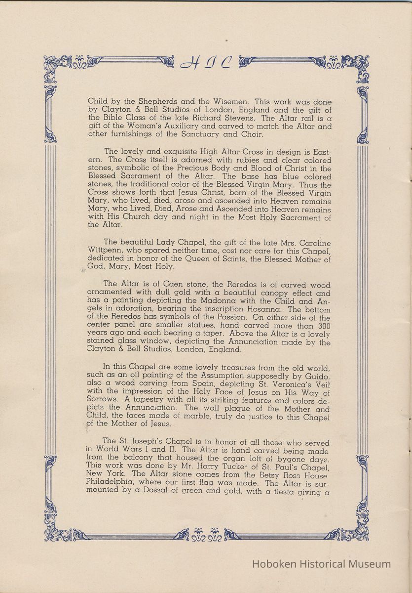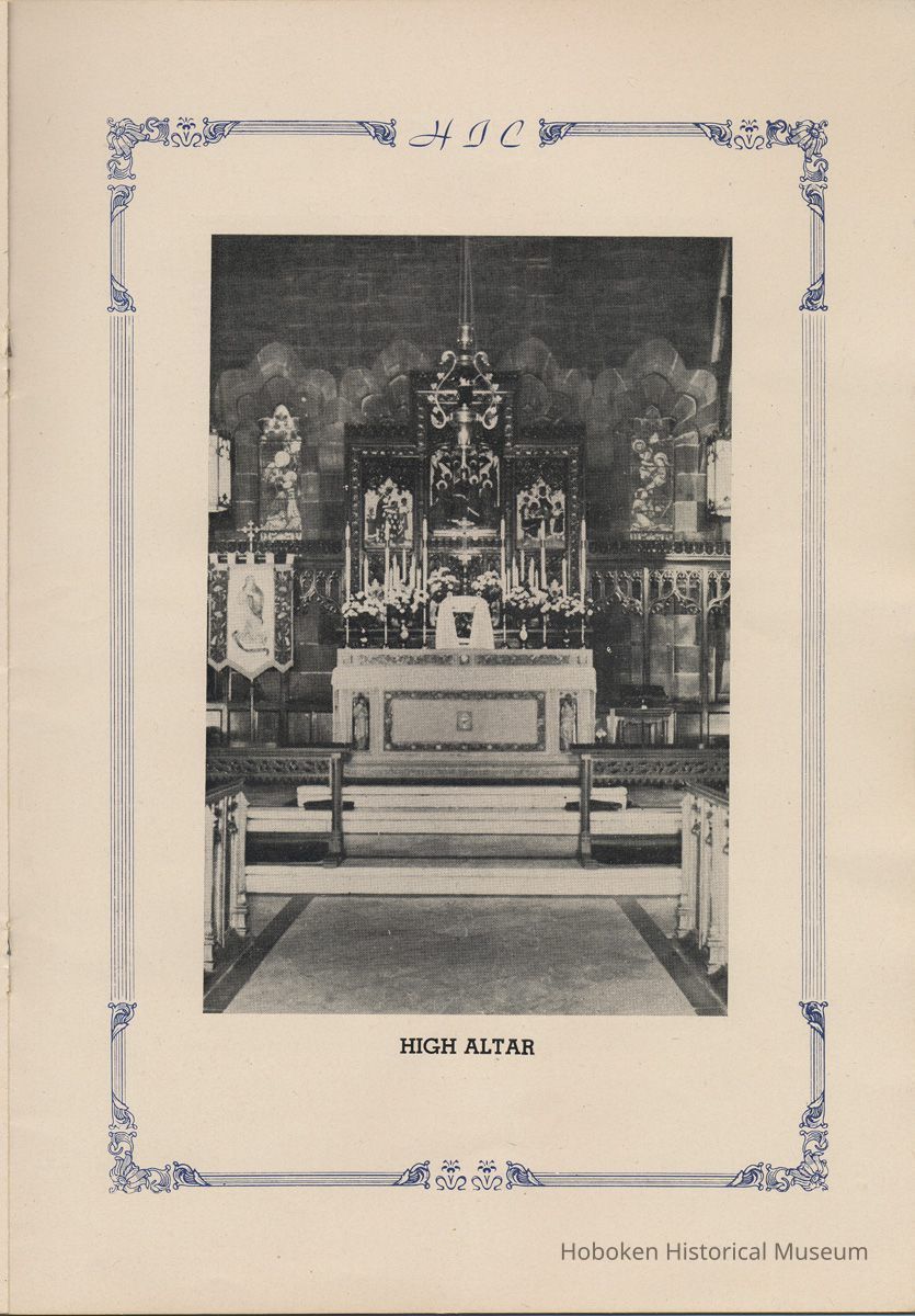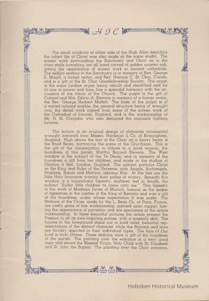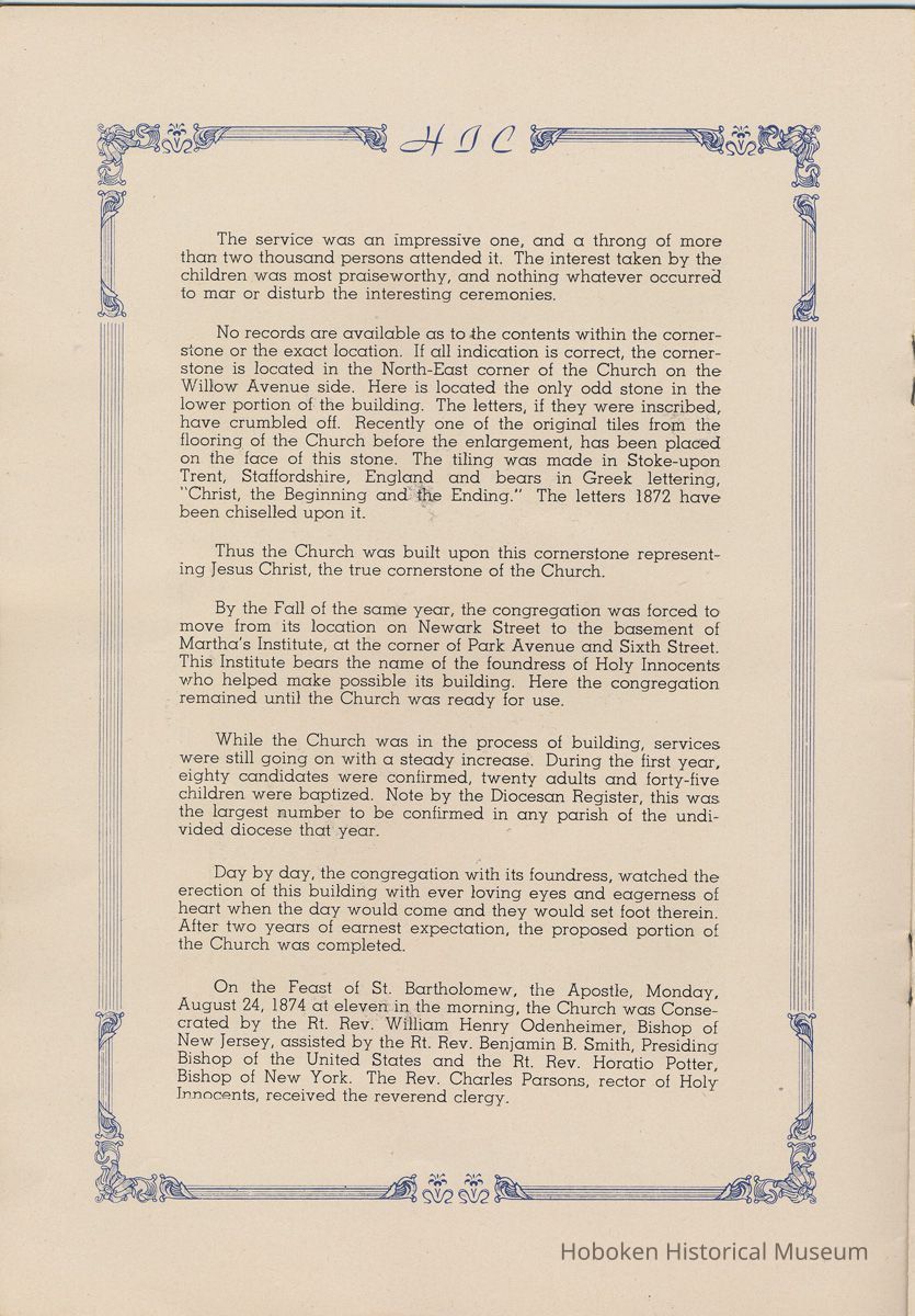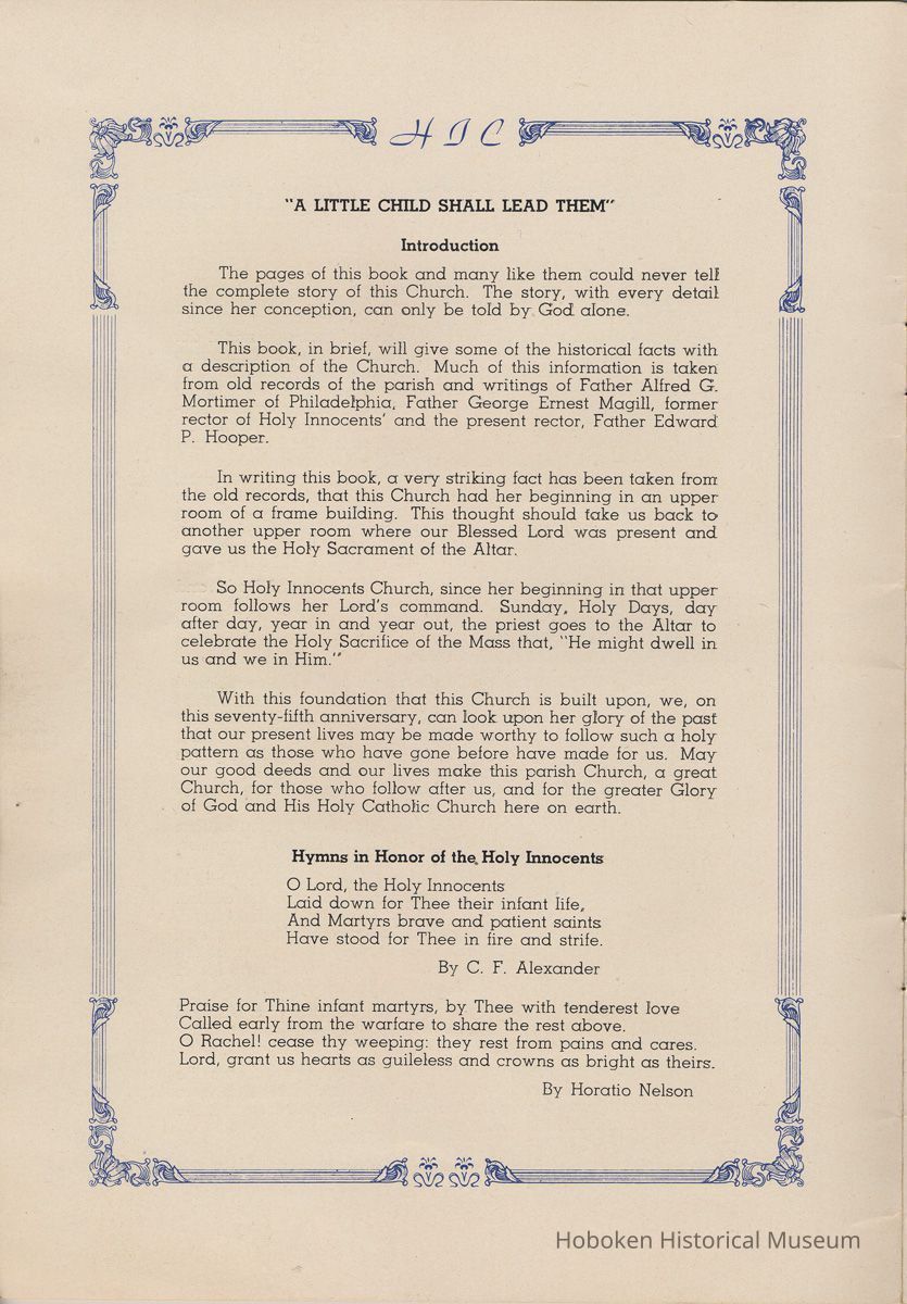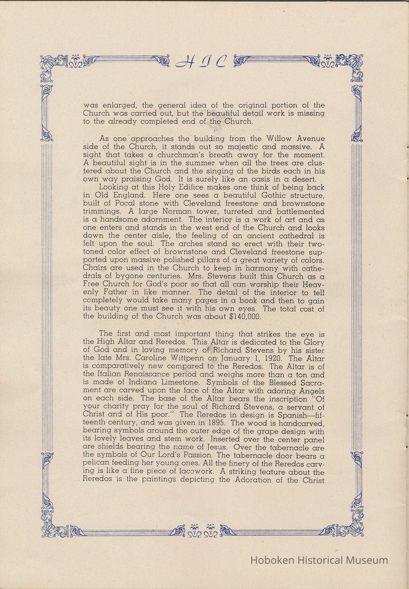 Notes: Transcription of main text in booklet 2009.017.0006: Church of the Holy Innocents. The Miniature Cathedral, Hoboken, New Jersey. Holy Innocents' Day, 1947, 75th Anniversary of Founding. By John J. Heaney, Sacristan. page [2] Dedication To the sweet and loving memory of a little child, Julia Augusta Stevens, daughter of Edwin Augustus and Martha Bayard Stevens. Born May 18th,1862. Died in Rome, Italy, December 26, 1870. Also of her saintly mother, Martha Bayard Stevens whose charity made possible the erection of this beautiful Church to the sacred memory of this sweet child taken from her into the land of Paradise. THEN WERE THERE BROUGHT UNTO HIM LITTLE CHILDREN, AND THE DISCIPLES REBUKED THEM. BUT JESUS SAID "SUFFER LITTLE CHILDREN, AND FORBID THEM NOT, TO COME UNTO ME; FOR SUCH IS THE KINGDOM OF HEAVEN." page [5]: [beneath photo of Martha Bayard Stevens] Martha Bayard Stevens Born May 15, 1831 Died April 1, 1899 To the people of Holy Innocents Church, the name of Martha Bayard Stevens has always stood for a wonderful benefactor, woman of noble piety, the gracious Lady Bountiful of the Parish which she built and loved so dearly. To those who knew and loved her, she was a revered memory, and to those who came after her shall love and respect her for her great life shown forth in the history of this Church. pg [6]: [biography / obituary of Martha Bayard Dodd Stevens] Martha Bayard Stevens was born in the little town of Princeton, New Jersey. Her father was Professor Albert Dodd of Princeton University, one of the most learned men to hold seat as teacher of Mathematics in that great university. She was reared in the strict faith of Presbyterianism of that day. At an early age, the family was plunged into complete poverty by the death of her father, Professor Dodd. By the time she reached sixteen, Martha Bayard Dodd was helping her mother support the family by teaching sewing and doing any chores that a girl of that age might do. She even prepared three younger brothers for their entrance into college. From this humble home, with all its love, affection, and culture, Martha Bayard Dodd took these qualities with her to the immense estate with its beautiful mansion overlooking the Hudson, upon becoming the adored wife of the wealthy Edwin Augustus Stevens. Here she was known as the Mistress and Lady of Stevens' Castle. To this marriage was born several children and it was the death of her little daughter, Julia Augusta, who died in Rome, on December 26, 1870, that persuaded Mrs. Stevens to build this Church. Mrs. Stevens became a devout lover and communicant of the Episcopal Church and was much impressed by the burial services conducted in Rome for her daughter. Through her life Mrs. Stevens with all her wealth still remained in her qualities, the plain Martha Bayard Dodd and never forgot her humble early background. Mrs. Stevens never tired of searching for beautiful treasures to put into the Church and during the latter days of her life found her greatest comfort in its Masses, services and ministrations. On Easter Eve, April 1, 1899, God in His all wise providence called this saintly woman home to her Eternal reward. People of all walks of life journeyed to Castle Point to pay their last respects to this dear woman. Scarcely a dry eye left the room, many thoughts were brought back, to this woman whose purse was never closed to any good deed of charity. On Tuesday, April 4th, the body was brought at an early hour to the Church to repose before the High Altar. Requiem Masses were offered at 6:30 AM., 7:30 A.M., and a Private Mass for the family was offered at 9:00 A.M., by the former rector, Father Moffett. At 11:00 A.M. a public service was held, only immediate relatives and friends were admitted to the Church. Over five thousand persons flanked the outside of the edifice. Bishop Starkey was present assisted by Rev. Father Magill, Rev. James Clayton Mitchell, Rev. Archdeacon W. R. Jenvey and several other clergymen. The full choir of the Church of the Transfiguration, New York, sang for the occasion. Miss Maud Morgan the well known harpist assisted the organist. After the service, the cortege, which consisted of a hundred carriages, proceeded to Hoboken Cemetery where the Choir sang hymns while the committal took place. The cross above Martha Bayard Stevens' grave bears the text, "Today shalt thou be with Me in Paradise." How true were the words of Jesus, for surely she was that day and forever more with her Lord in Paradise pg [7] 'A LITTLE CHILD SHALL LEAD THEM' Introduction The pages of this book and many like them could never tell the complete story of this Church. The story, with every detail since her conception, can only be told by God alone. This book, in brief, will give some of the historical facts with a description of the Church. Much of this information is taken from old records of the parish and writings of Father Alfred G. Mortimer of Philadelphia, Father George Ernest Magill, former rector of Holy Innocents' and the present rector, Father Edward P. Hooper. In writing this book, a very striking fact has been taken from the old records, that this Church had her beginning in an upper room of a frame building. This thought should take us back to another upper room where our Blessed Lord was present and gave us the Holy Sacrament of the Altar. So Holy Innocents Church, since her beginning in that upper room follows her Lord's command. Sunday, Holy Days, day after day, year in and year out, the priest goes to the Altar to celebrate the Holy Sacrifice of the Mass that. "He might dwell in us and we in Him." With this foundation that this Church is built upon, we, on this seventy-fifth anniversary, can look upon her glory of the past that our present lives may be made worthy to follow such a holy pattern as those who have gone before have made for us. May our good deeds and our lives make this parish Church, a great Church, for those who follow after us, and for the greater Gl