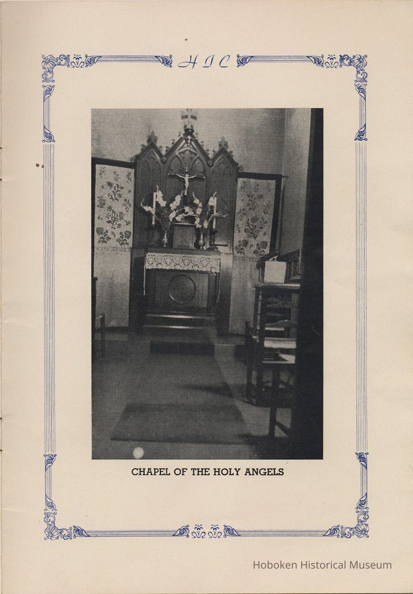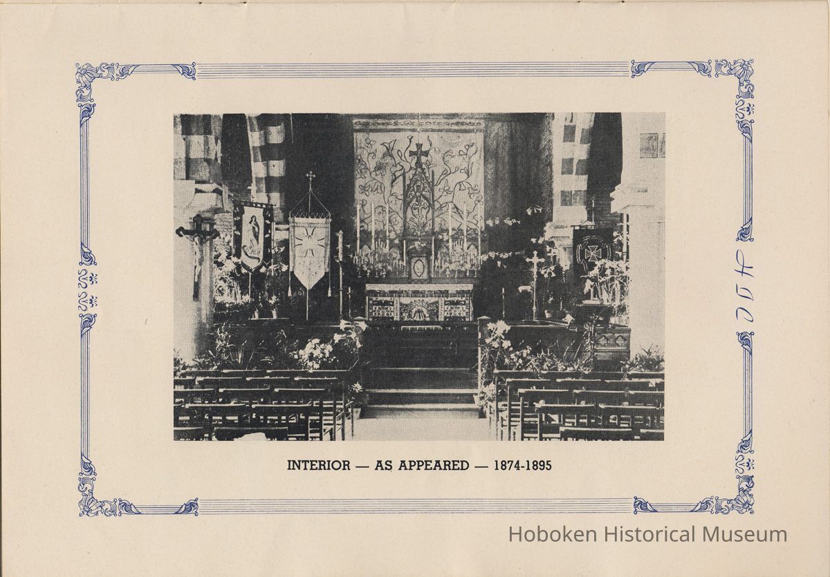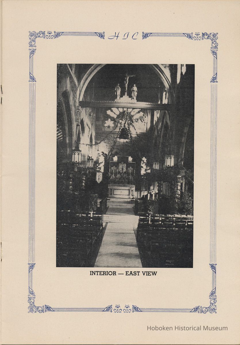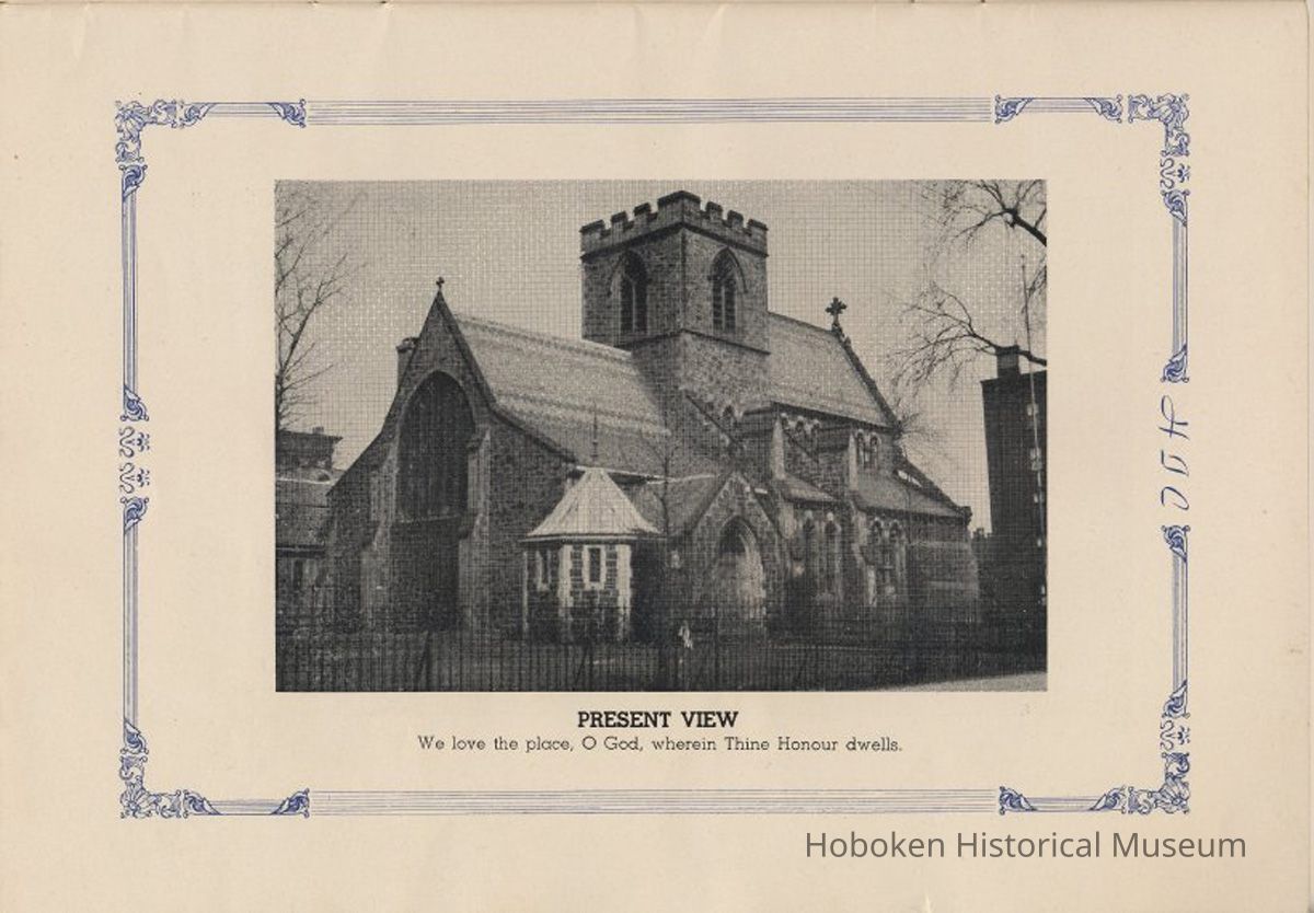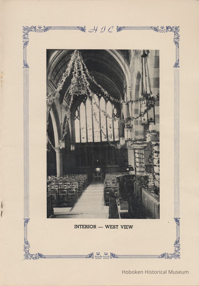 Notes: Transcription of main text in booklet 2009.017.0006: Church of the Holy Innocents. The Miniature Cathedral, Hoboken, New Jersey. Holy Innocents' Day, 1947, 75th Anniversary of Founding. By John J. Heaney, Sacristan. page [2] Dedication To the sweet and loving memory of a little child, Julia Augusta Stevens, daughter of Edwin Augustus and Martha Bayard Stevens. Born May 18th,1862. Died in Rome, Italy, December 26, 1870. Also of her saintly mother, Martha Bayard Stevens whose charity made possible the erection of this beautiful Church to the sacred memory of this sweet child taken from her into the land of Paradise. THEN WERE THERE BROUGHT UNTO HIM LITTLE CHILDREN, AND THE DISCIPLES REBUKED THEM. BUT JESUS SAID "SUFFER LITTLE CHILDREN, AND FORBID THEM NOT, TO COME UNTO ME; FOR SUCH IS THE KINGDOM OF HEAVEN." page [5]: [beneath photo of Martha Bayard Stevens] Martha Bayard Stevens Born May 15, 1831 Died April 1, 1899 To the people of Holy Innocents Church, the name of Martha Bayard Stevens has always stood for a wonderful benefactor, woman of noble piety, the gracious Lady Bountiful of the Parish which she built and loved so dearly. To those who knew and loved her, she was a revered memory, and to those who came after her shall love and respect her for her great life shown forth in the history of this Church. pg [6]: [biography / obituary of Martha Bayard Dodd Stevens] Martha Bayard Stevens was born in the little town of Princeton, New Jersey. Her father was Professor Albert Dodd of Princeton University, one of the most learned men to hold seat as teacher of Mathematics in that great university. She was reared in the strict faith of Presbyterianism of that day. At an early age, the family was plunged into complete poverty by the death of her father, Professor Dodd. By the time she reached sixteen, Martha Bayard Dodd was helping her mother support the family by teaching sewing and doing any chores that a girl of that age might do. She even prepared three younger brothers for their entrance into college. From this humble home, with all its love, affection, and culture, Martha Bayard Dodd took these qualities with her to the immense estate with its beautiful mansion overlooking the Hudson, upon becoming the adored wife of the wealthy Edwin Augustus Stevens. Here she was known as the Mistress and Lady of Stevens' Castle. To this marriage was born several children and it was the death of her little daughter, Julia Augusta, who died in Rome, on December 26, 1870, that persuaded Mrs. Stevens to build this Church. Mrs. Stevens became a devout lover and communicant of the Episcopal Church and was much impressed by the burial services conducted in Rome for her daughter. Through her life Mrs. Stevens with all her wealth still remained in her qualities, the plain Martha Bayard Dodd and never forgot her humble early background. Mrs. Stevens never tired of searching for beautiful treasures to put into the Church and during the latter days of her life found her greatest comfort in its Masses, services and ministrations. On Easter Eve, April 1, 1899, God in His all wise providence called this saintly woman home to her Eternal reward. People of all walks of life journeyed to Castle Point to pay their last respects to this dear woman. Scarcely a dry eye left the room, many thoughts were brought back, to this woman whose purse was never closed to any good deed of charity. On Tuesday, April 4th, the body was brought at an early hour to the Church to repose before the High Altar. Requiem Masses were offered at 6:30 AM., 7:30 A.M., and a Private Mass for the family was offered at 9:00 A.M., by the former rector, Father Moffett. At 11:00 A.M. a public service was held, only immediate relatives and friends were admitted to the Church. Over five thousand persons flanked the outside of the edifice. Bishop Starkey was present assisted by Rev. Father Magill, Rev. James Clayton Mitchell, Rev. Archdeacon W. R. Jenvey and several other clergymen. The full choir of the Church of the Transfiguration, New York, sang for the occasion. Miss Maud Morgan the well known harpist assisted the organist. After the service, the cortege, which consisted of a hundred carriages, proceeded to Hoboken Cemetery where the Choir sang hymns while the committal took place. The cross above Martha Bayard Stevens' grave bears the text, "Today shalt thou be with Me in Paradise." How true were the words of Jesus, for surely she was that day and forever more with her Lord in Paradise pg [7] 'A LITTLE CHILD SHALL LEAD THEM' Introduction The pages of this book and many like them could never tell the complete story of this Church. The story, with every detail since her conception, can only be told by God alone. This book, in brief, will give some of the historical facts with a description of the Church. Much of this information is taken from old records of the parish and writings of Father Alfred G. Mortimer of Philadelphia, Father George Ernest Magill, former rector of Holy Innocents' and the present rector, Father Edward P. Hooper. In writing this book, a very striking fact has been taken from the old records, that this Church had her beginning in an upper room of a frame building. This thought should take us back to another upper room where our Blessed Lord was present and gave us the Holy Sacrament of the Altar. So Holy Innocents Church, since her beginning in that upper room follows her Lord's command. Sunday, Holy Days, day after day, year in and year out, the priest goes to the Altar to celebrate the Holy Sacrifice of the Mass that. "He might dwell in us and we in Him." With this foundation that this Church is built upon, we, on this seventy-fifth anniversary, can look upon her glory of the past that our present lives may be made worthy to follow such a holy pattern as those who have gone before have made for us. May our good deeds and our lives make this parish Church, a great Church, for those who follow after us, and for the greater Gl
