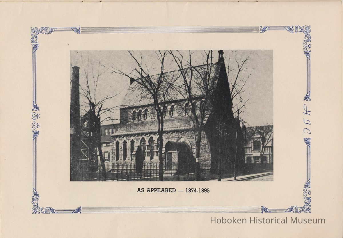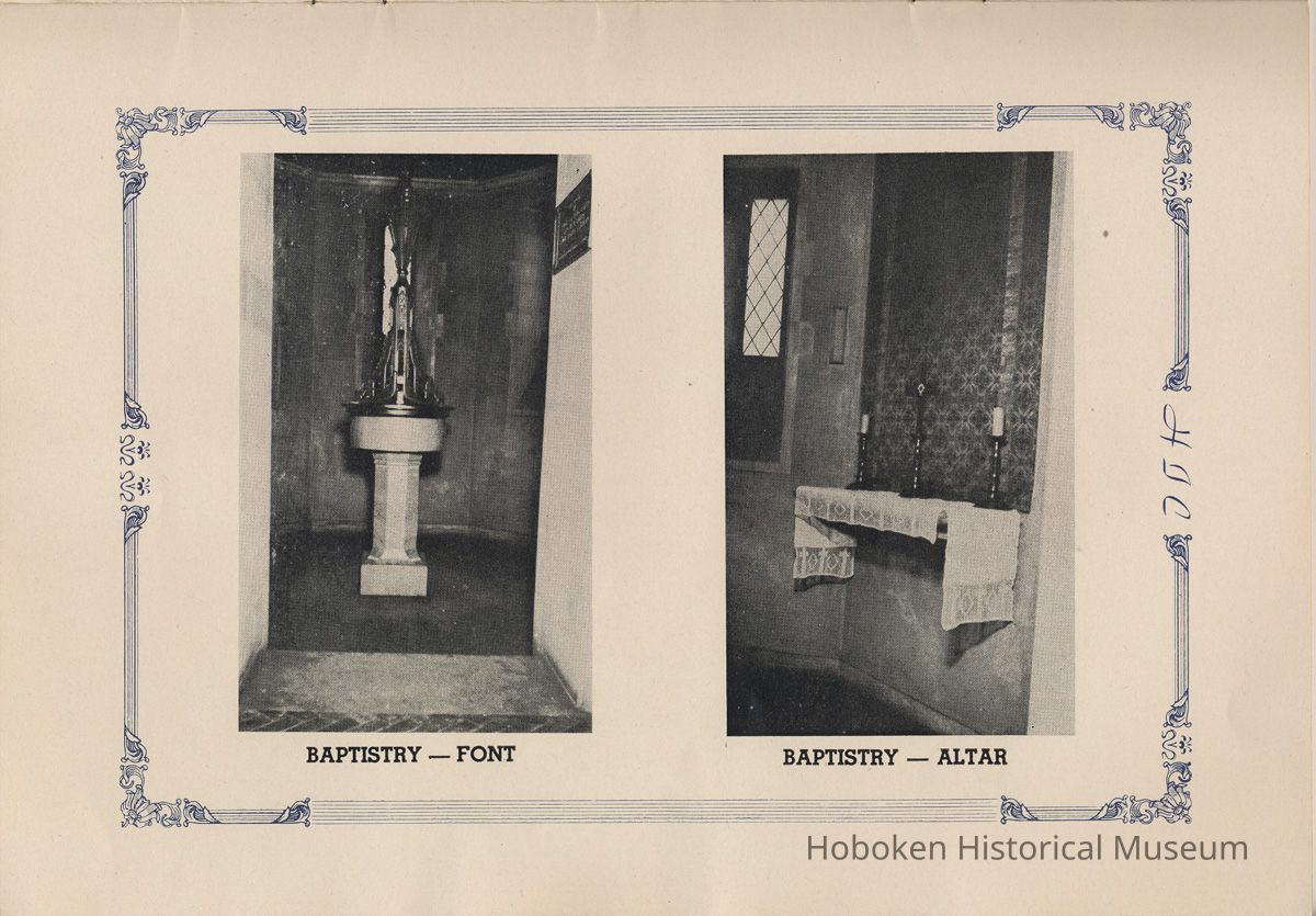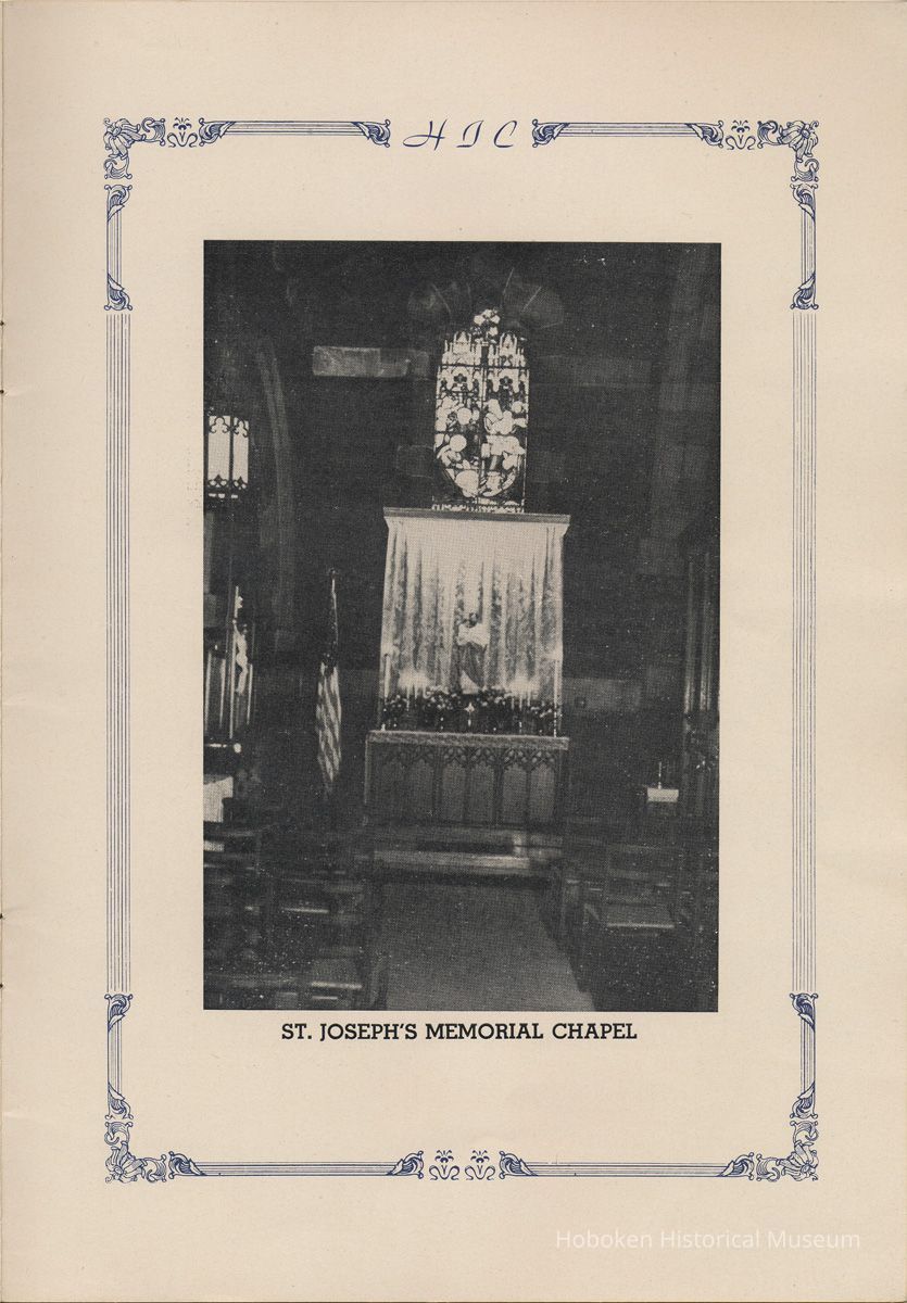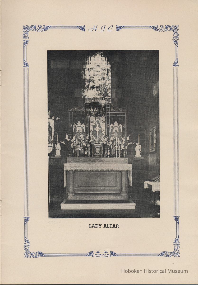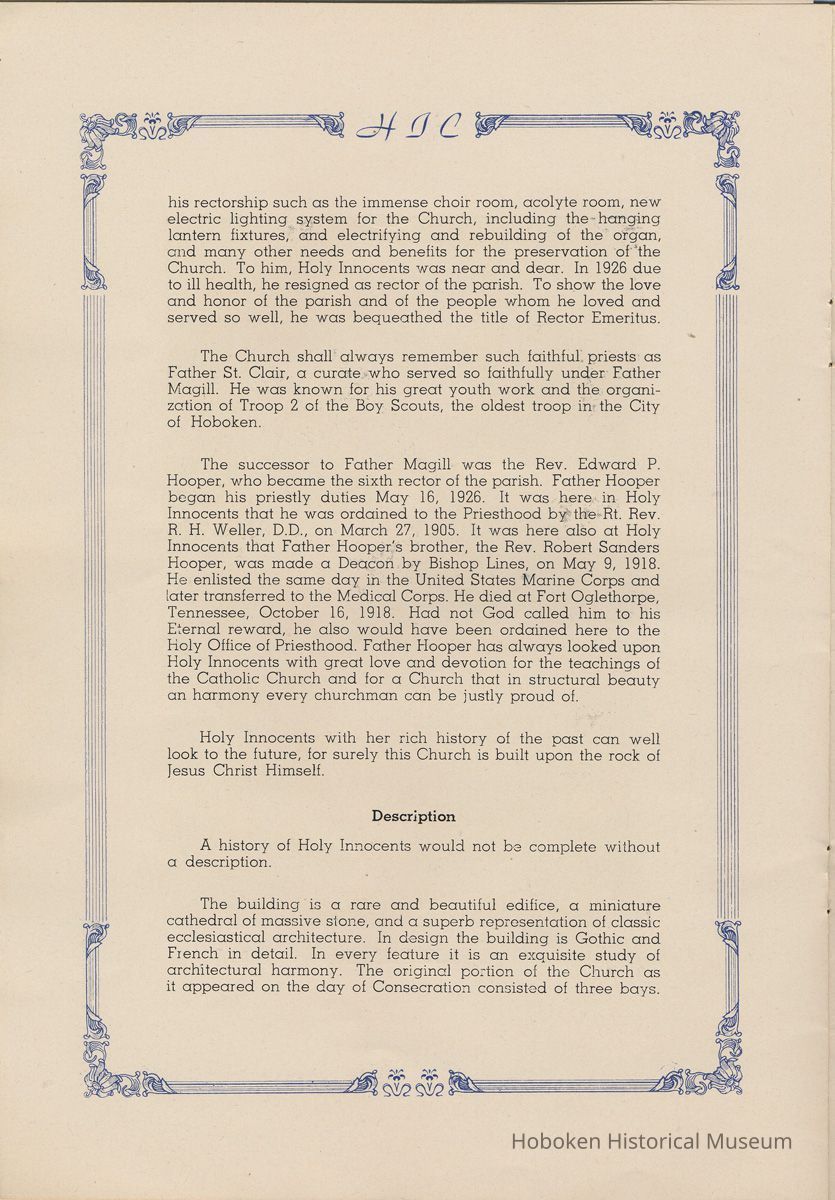 Notes: Transcription of main text in booklet 2009.017.0006: Church of the Holy Innocents. The Miniature Cathedral, Hoboken, New Jersey. Holy Innocents' Day, 1947, 75th Anniversary of Founding. By John J. Heaney, Sacristan. page [2] Dedication To the sweet and loving memory of a little child, Julia Augusta Stevens, daughter of Edwin Augustus and Martha Bayard Stevens. Born May 18th,1862. Died in Rome, Italy, December 26, 1870. Also of her saintly mother, Martha Bayard Stevens whose charity made possible the erection of this beautiful Church to the sacred memory of this sweet child taken from her into the land of Paradise. THEN WERE THERE BROUGHT UNTO HIM LITTLE CHILDREN, AND THE DISCIPLES REBUKED THEM. BUT JESUS SAID "SUFFER LITTLE CHILDREN, AND FORBID THEM NOT, TO COME UNTO ME; FOR SUCH IS THE KINGDOM OF HEAVEN." page [5]: [beneath photo of Martha Bayard Stevens] Martha Bayard Stevens Born May 15, 1831 Died April 1, 1899 To the people of Holy Innocents Church, the name of Martha Bayard Stevens has always stood for a wonderful benefactor, woman of noble piety, the gracious Lady Bountiful of the Parish which she built and loved so dearly. To those who knew and loved her, she was a revered memory, and to those who came after her shall love and respect her for her great life shown forth in the history of this Church. pg [6]: [biography / obituary of Martha Bayard Dodd Stevens] Martha Bayard Stevens was born in the little town of Princeton, New Jersey. Her father was Professor Albert Dodd of Princeton University, one of the most learned men to hold seat as teacher of Mathematics in that great university. She was reared in the strict faith of Presbyterianism of that day. At an early age, the family was plunged into complete poverty by the death of her father, Professor Dodd. By the time she reached sixteen, Martha Bayard Dodd was helping her mother support the family by teaching sewing and doing any chores that a girl of that age might do. She even prepared three younger brothers for their entrance into college. From this humble home, with all its love, affection, and culture, Martha Bayard Dodd took these qualities with her to the immense estate with its beautiful mansion overlooking the Hudson, upon becoming the adored wife of the wealthy Edwin Augustus Stevens. Here she was known as the Mistress and Lady of Stevens' Castle. To this marriage was born several children and it was the death of her little daughter, Julia Augusta, who died in Rome, on December 26, 1870, that persuaded Mrs. Stevens to build this Church. Mrs. Stevens became a devout lover and communicant of the Episcopal Church and was much impressed by the burial services conducted in Rome for her daughter. Through her life Mrs. Stevens with all her wealth still remained in her qualities, the plain Martha Bayard Dodd and never forgot her humble early background. Mrs. Stevens never tired of searching for beautiful treasures to put into the Church and during the latter days of her life found her greatest comfort in its Masses, services and ministrations. On Easter Eve, April 1, 1899, God in His all wise providence called this saintly woman home to her Eternal reward. People of all walks of life journeyed to Castle Point to pay their last respects to this dear woman. Scarcely a dry eye left the room, many thoughts were brought back, to this woman whose purse was never closed to any good deed of charity. On Tuesday, April 4th, the body was brought at an early hour to the Church to repose before the High Altar. Requiem Masses were offered at 6:30 AM., 7:30 A.M., and a Private Mass for the family was offered at 9:00 A.M., by the former rector, Father Moffett. At 11:00 A.M. a public service was held, only immediate relatives and friends were admitted to the Church. Over five thousand persons flanked the outside of the edifice. Bishop Starkey was present assisted by Rev. Father Magill, Rev. James Clayton Mitchell, Rev. Archdeacon W. R. Jenvey and several other clergymen. The full choir of the Church of the Transfiguration, New York, sang for the occasion. Miss Maud Morgan the well known harpist assisted the organist. After the service, the cortege, which consisted of a hundred carriages, proceeded to Hoboken Cemetery where the Choir sang hymns while the committal took place. The cross above Martha Bayard Stevens' grave bears the text, "Today shalt thou be with Me in Paradise." How true were the words of Jesus, for surely she was that day and forever more with her Lord in Paradise pg [7] 'A LITTLE CHILD SHALL LEAD THEM' Introduction The pages of this book and many like them could never tell the complete story of this Church. The story, with every detail since her conception, can only be told by God alone. This book, in brief, will give some of the historical facts with a description of the Church. Much of this information is taken from old records of the parish and writings of Father Alfred G. Mortimer of Philadelphia, Father George Ernest Magill, former rector of Holy Innocents' and the present rector, Father Edward P. Hooper. In writing this book, a very striking fact has been taken from the old records, that this Church had her beginning in an upper room of a frame building. This thought should take us back to another upper room where our Blessed Lord was present and gave us the Holy Sacrament of the Altar. So Holy Innocents Church, since her beginning in that upper room follows her Lord's command. Sunday, Holy Days, day after day, year in and year out, the priest goes to the Altar to celebrate the Holy Sacrifice of the Mass that. "He might dwell in us and we in Him." With this foundation that this Church is built upon, we, on this seventy-fifth anniversary, can look upon her glory of the past that our present lives may be made worthy to follow such a holy pattern as those who have gone before have made for us. May our good deeds and our lives make this parish Church, a great Church, for those who follow after us, and for the greater Gl