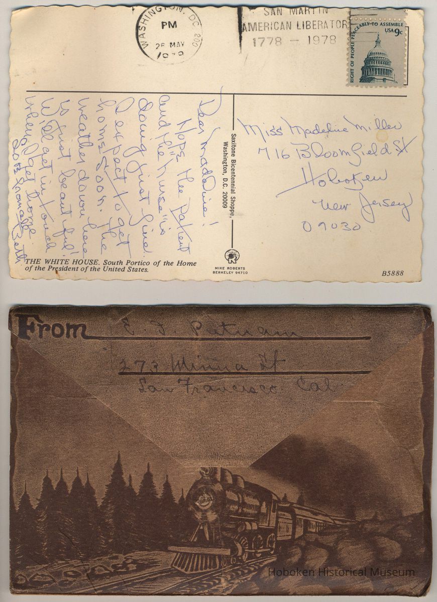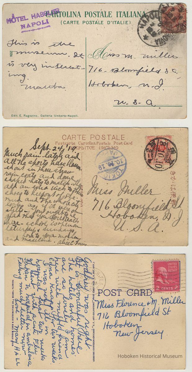 Postcards, 7, sent to Florence and/or Madeline Miller, 716 Bloomfield St., Hoboken from various people, v.d., ca.1910-1978.