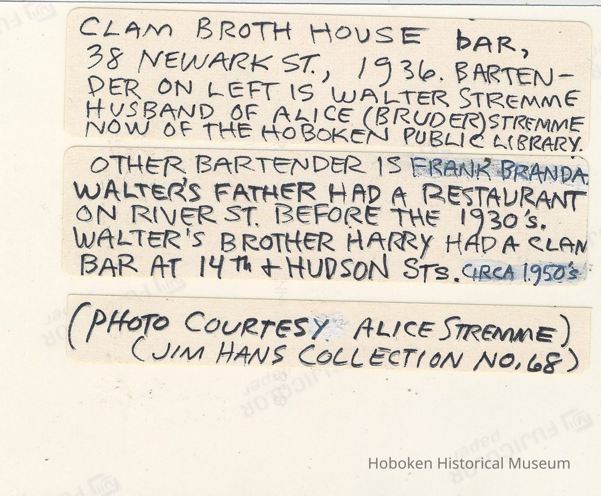 Photo catalog reference record of sepia-tone copy photo of interior of Clam Broth House bar, 38 Newark St., Hoboken, 1936. 4" x 5" wide print. Photographer not indicated; photo courtesy of Alice Bruder Stremme. Reverse has text by Jim Hans. See notes. Original in archives. See related.