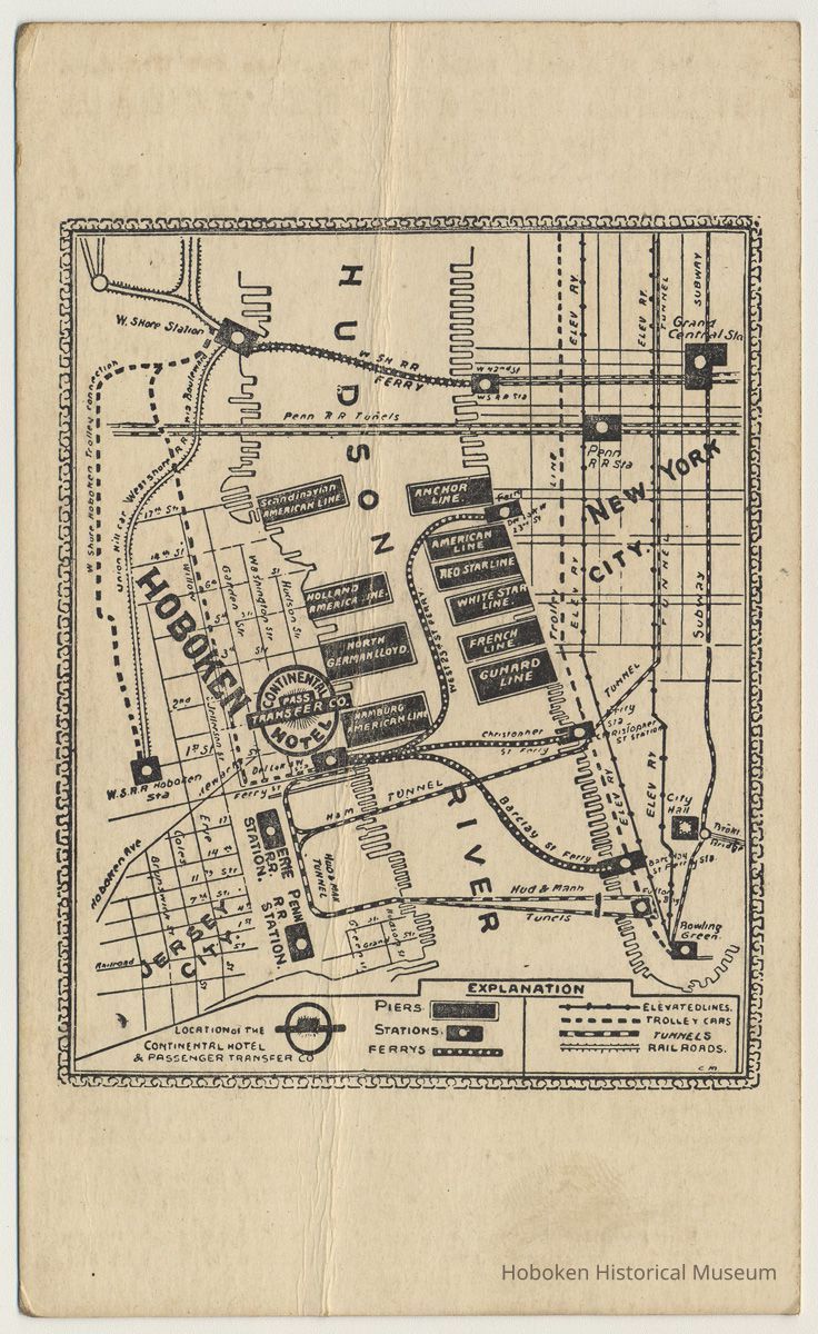 Notes: Archives 2009.006.0124 Text on front at top: Morris Bauman, Pres., Telephone 687 Hoboken. Continental Hotel & Passenger Transfer Co., 101 Hudson Street, Cor. First Stree[t], Hoboken, N.J. Newly Furnished and Renovated. Central vignette is a depiction of the hotel exterior, "The Perfect Place for European Travelers", flanked by "Under New Management" running vertical at both edges. Text below vignette: Opposite the Piers of: Hamburg-American Line, North German Lloyd, Holland-Amerika[sic] Line and within 10 minutes wal of the Scandinavian American Line. The Cunard, White Star, Red Star, American, French and Anchor Line Piers are reached within 15 minutes. The Terminals of the Delaware Lackawanna & Western, Erie, Lehigh Valley, Pennsylvania Railroads are within 2 to 10 minutes of the Hotel. The Pennsylvania, New York Central and Baltimore Ohio R.R. Terminals are reached within 20 minutes. (over) ==== The back of the card has a map which shows Hoboken and part of Manhattan. For Hoboken, major steamship line piers are labeled as well as all the railroads (including those in Jersey City), ferries, tunnels (Hudson & Manhattan, Pennsylvania Railroad) and major trolley lines (West Shore Railroad / Hoboken/Trolley Connection including their ferry in Weehawken.) On the New York City side, again major ship piers as well as the major rail terminals (Penn Station, Grand Central elevated railways and the new subway. Status: OK Status By: dw Status Date: 2009-07-07