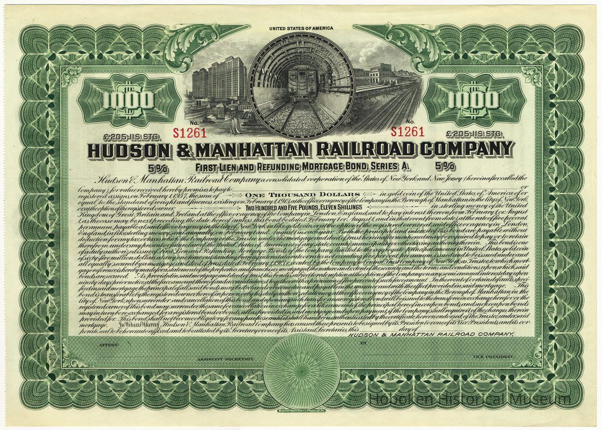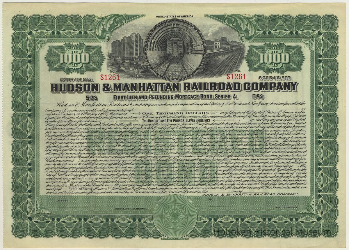 Mortgage bond: Hudson & Manhattan Railroad Company Registered First Lien and Refunding Mortgage Bond, Series A, $1000, £205,11S [Shillings] Stg. [Sterling], Five Percent. Principal Payable February 1st, 1957; Interest payable February 1st and August 1st; Principal and Interest Payable in the City of New York or London, England; ...dated February 1, 1913; Central Hanover Bank and Trust Company, Trustee. Number S1231. Unissued. Engraved banknote paper, 9-3/4" high x 13-3/8" wide.