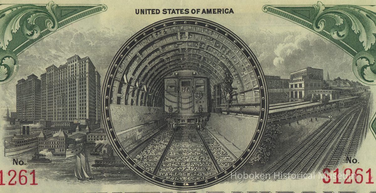 Mortgage bond: Hudson & Manhattan Railroad Company Registered First Lien and Refunding Mortgage Bond, Series A, $1000, £205,11S [Shillings] Stg. [Sterling], Five Percent. Principal Payable February 1st, 1957; Interest payable February 1st and August 1st; Principal and Interest Payable in the City of New York or London, England; ...dated February 1, 1913; Central Hanover Bank and Trust Company, Trustee. Number S1231. Unissued. Engraved banknote paper, 9-3/4" high x 13-3/8" wide.