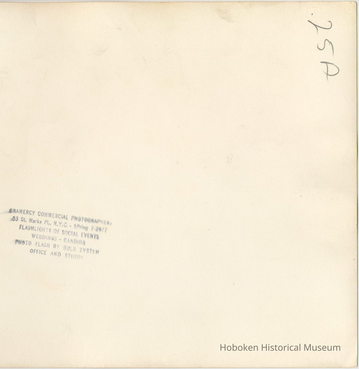 Black-and-white photo of John J. Grogan addressing a dinner at the Union Club, Hoboken, no date, circa 1950's. 8" x 10" wide print. Reverse has photographer's ink stamp: Gramercy Commercial Photographer; penciled notation: 25A.