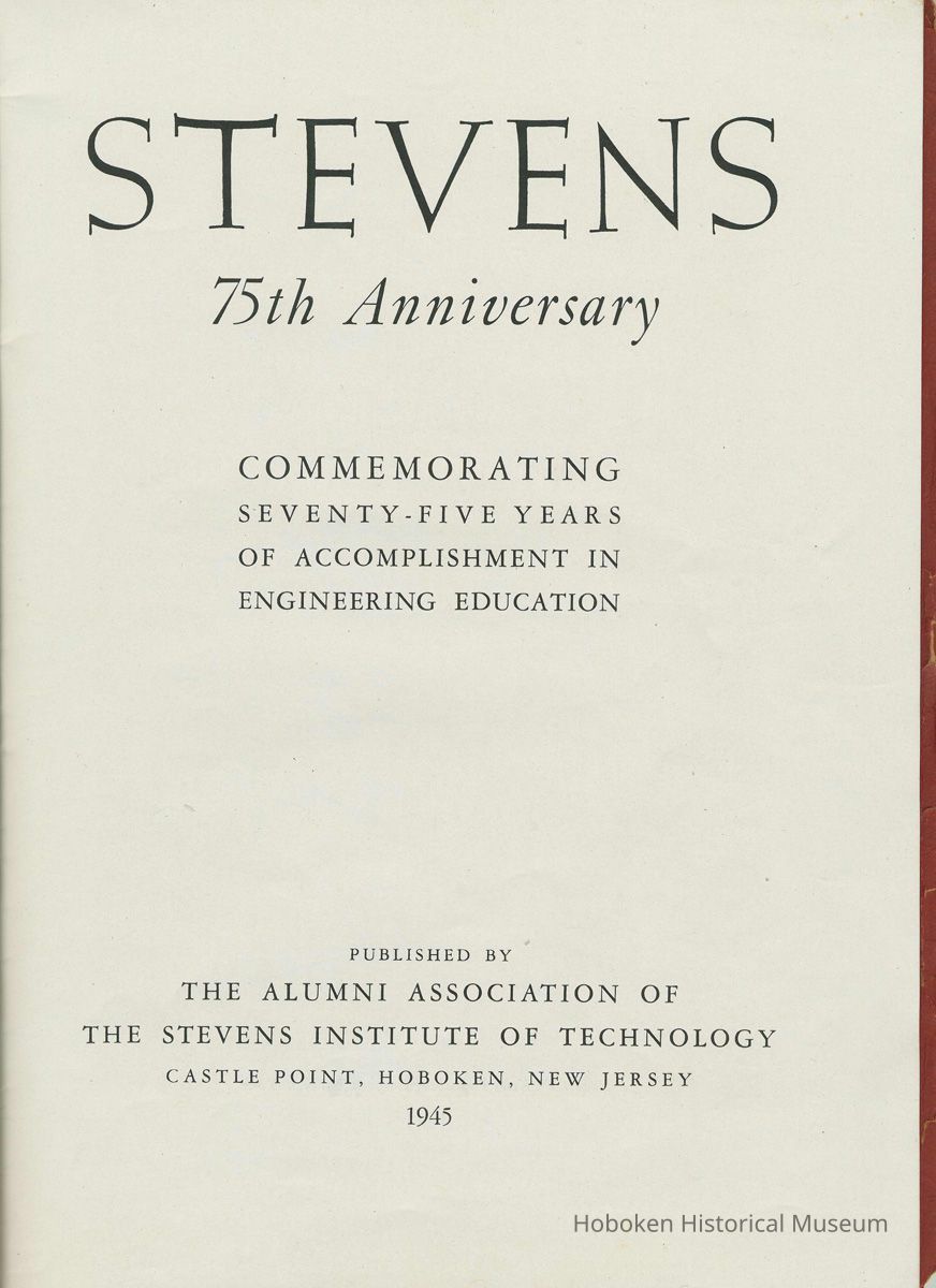Stevens 75th Anniversary booklet. Published by The Alumni Association of the Stevens Institute of Technology, Castle Point, Hoboken, N.J., 1945. 4to printed red wrappers. pp. xii, 52, 29 illustrations