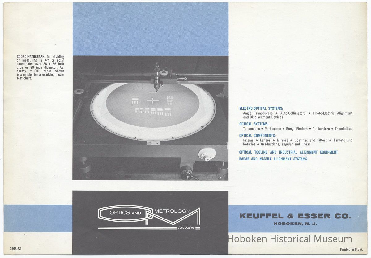 Brochure: K&E Capabilities in Target, Scale and Reticle Production. Keuffel & Esser Co., Optics and Metrology Division, Hoboken, N.J., no date, circa 1961-1965. Single folio, 11-1/2" wide x 8" high, [4] pp.