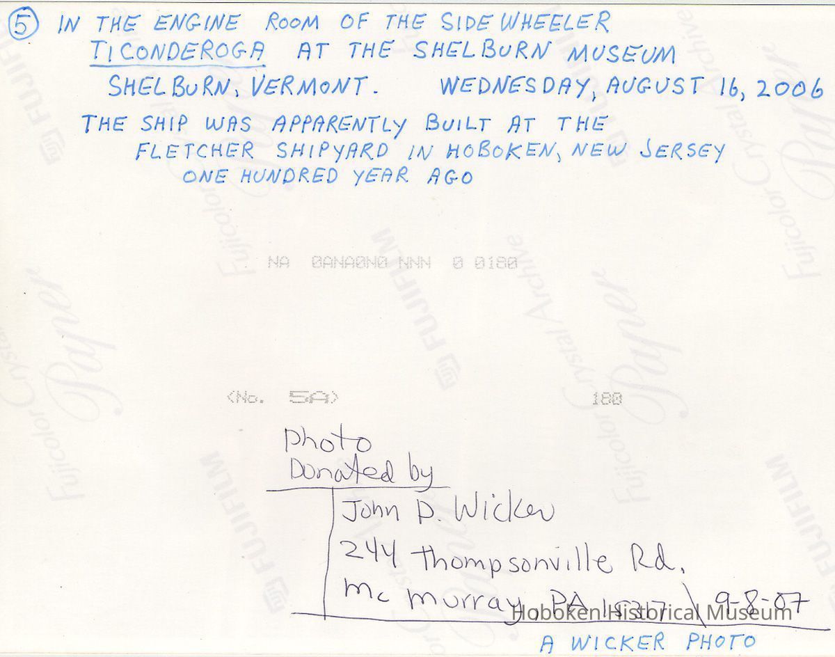Color photo of the W. & A. Fletcher manufacturer's plate in the Engine Room of the steamship Ticonderoga at the Shelburne Museum, Vt., August 16, 2006. 5" x 7" wide print. Photo taken by John P. Wicker. Reverse has notes by the photographer.