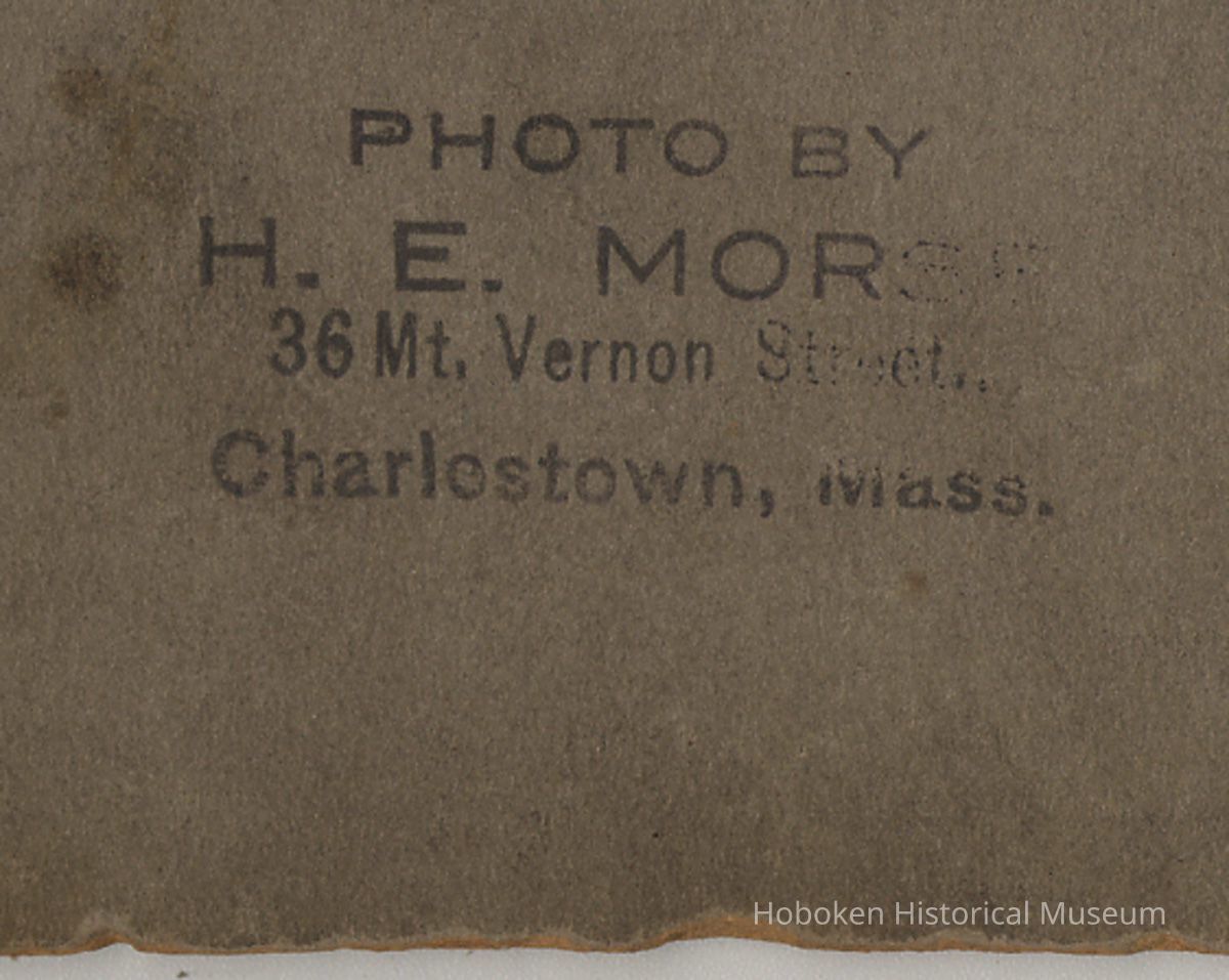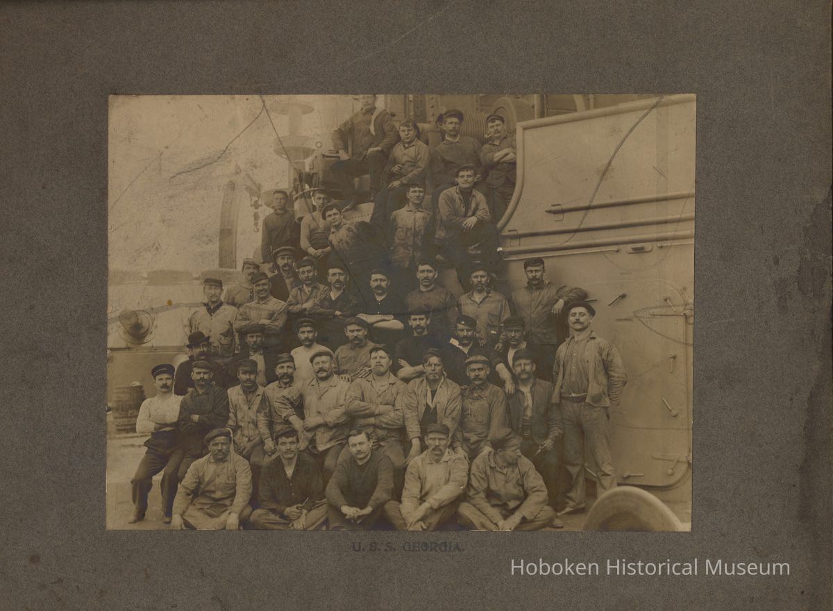Sepia tone photo of shipyard workers posed on deck of the U.S.S. Georgia at Bath Iron Works, Bath, Maine. No date, probably May 1906. 6" x 8" wide printed on 10" x 12" photographer's mount. Photographer was H.E. Morse, Charlestown, Mass. as stamped on the reverse which is otherwise blank. Ink stamped title of ship's name beneath print.