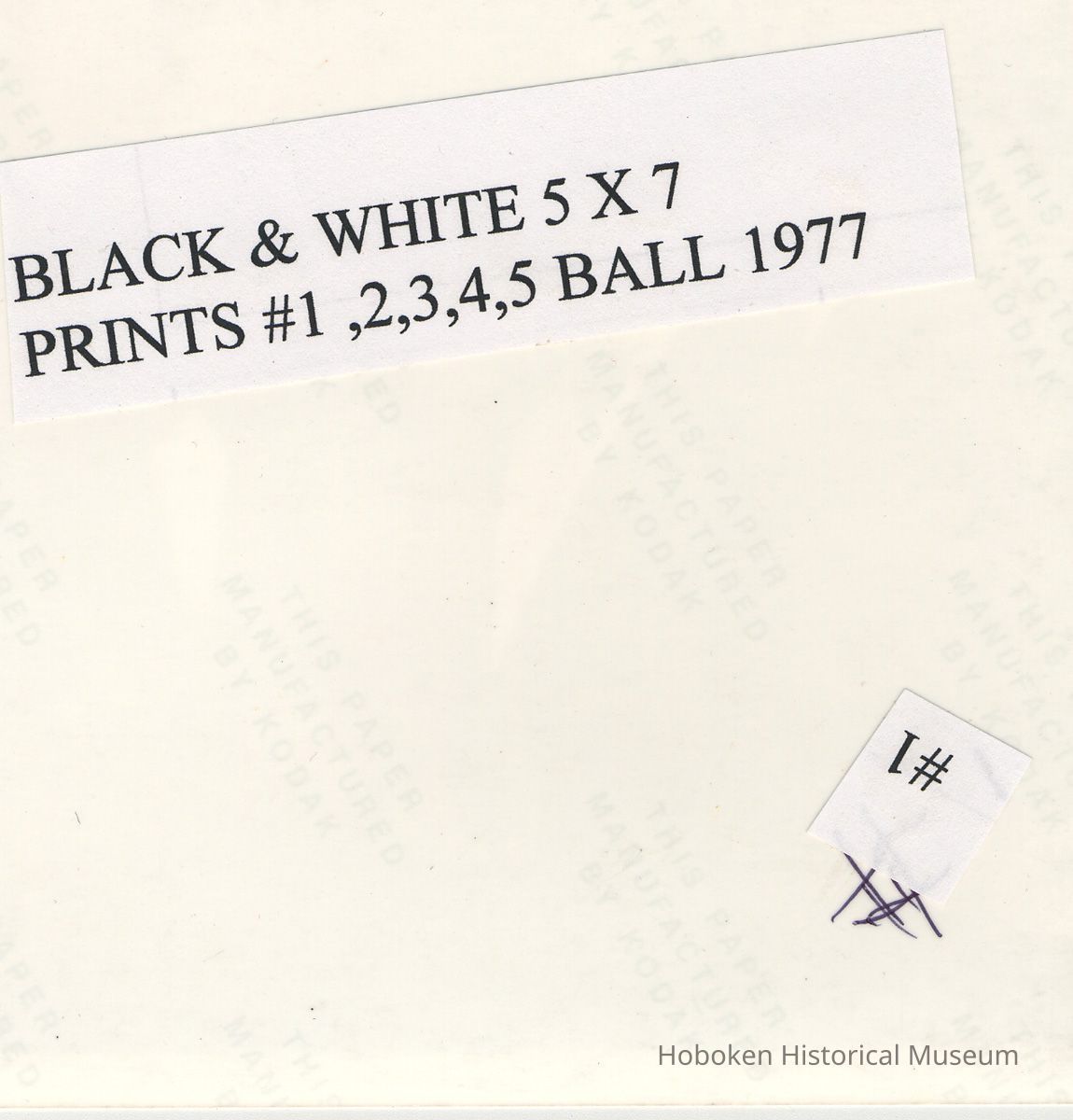 5" x 7" prints. Photos taken by Peter De Simone. Labeled "Black & White 5 x 7 Prints #1,2,3,4,5, Ball 1977" on print #1 by the photographer on the reverse; others have only the print number. People have not been individually identified, except for Dominic & Lucille Casulli.