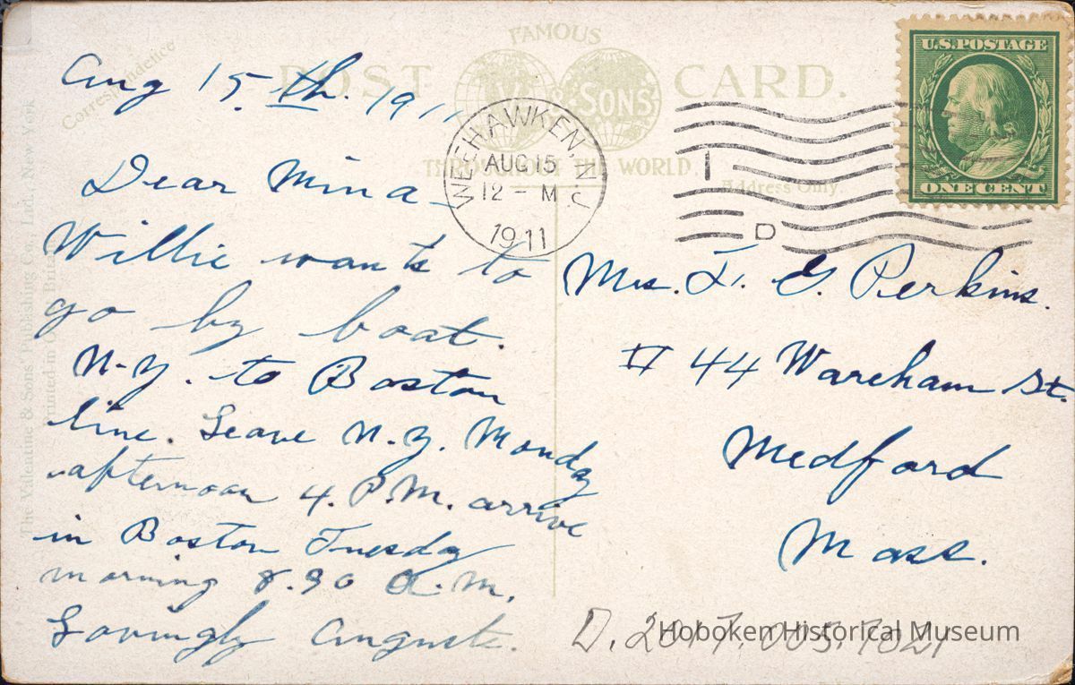 Postcard: Palisades and Road to West Shore Ferry Weehawken, NJ(Trolley pictured) Postmarked Aug 15, 1911 Colorized 3 1/2 x 5 1/2" DUPLICATE Published by The Valkentine & Sons Co., NY