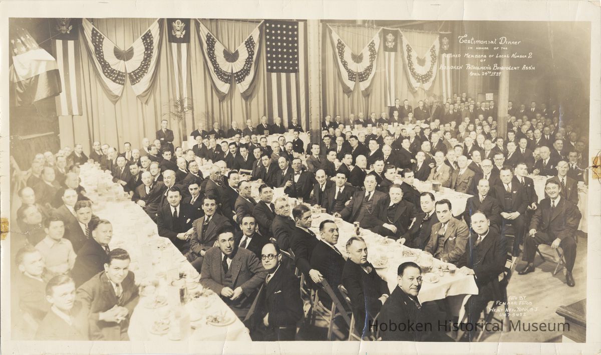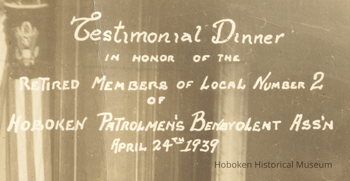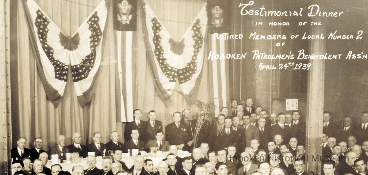 Sepia-tone panoramic group photo: Testimonial Dinner in honor of the Retired Members of Local Number 2 of Hoboken Patrolmen's Benevolent Association, April 24, 1939. No place, probably Union City. Photograph by Fennar Fotos, West New York, as seen in lower right corner. Captioned in image at top right. Reverse is blank. People have not been individually identified except in a detail from the upper right: Mayor Bernard McFeely is the fourth man from the left of the men seated under the bunting.