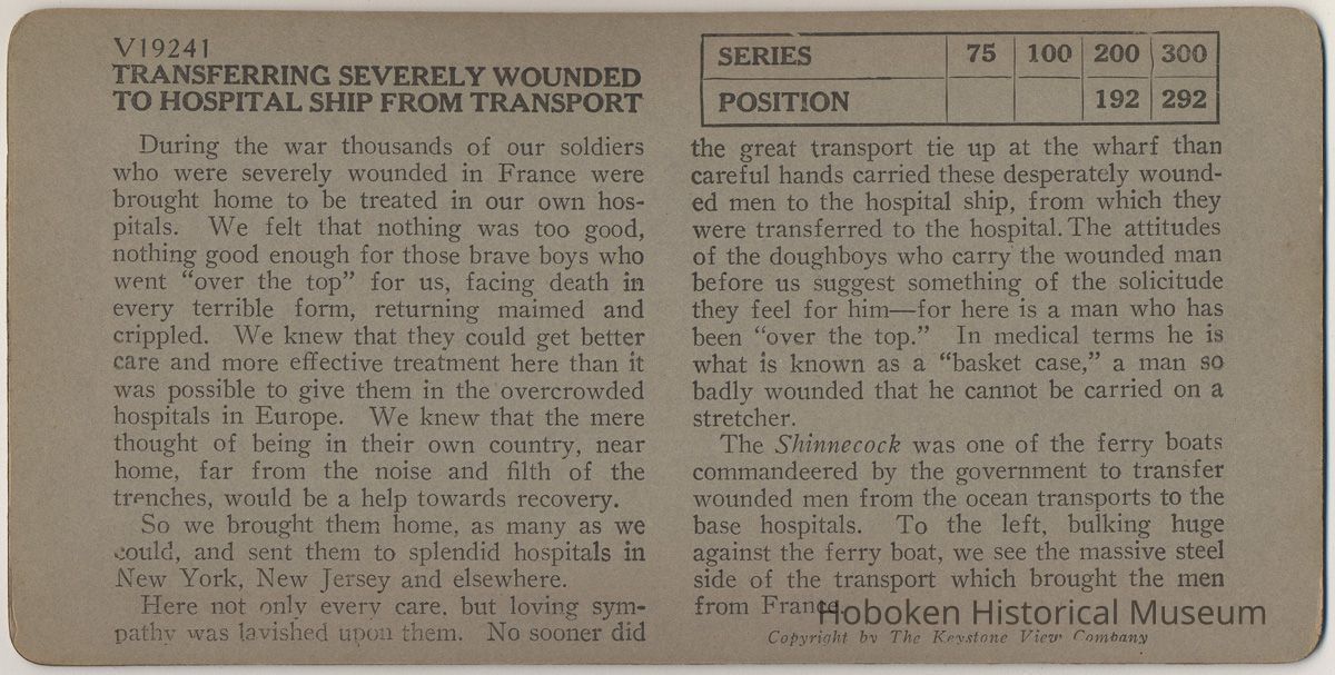 Notes: Text printed on verso of card: V18241 Transferring Severely Wounded to Hospital Ship from Transport. During the war thousands of our soldiers who were severely wounded in France were brought home to be treated in our own hospitals. We felt that nothing was too good, nothing good enough for thos brave boys who went "over the top" for us, facing death in every terrible form, returning maimed and crippled. We knew they could get better care and more effective treatment here than it was possible to give them in the overcrowded hospitals of Europe. We knew that the mere thought of being in their own country, near home, far from the noise and filth of the trenches, would be a help towards recovery. So we brought them home, as many as we could, and sent them to splendid hospitals in New York, New Jersey and elsewhere. Here not only very care, but loving sympathy was lavished upon them. No sooner did the great transport tie up at the wharf than careful hands carried these desparately wounded men to the hospital ship, from which they were transferred to the hospital. The attitudes of the doughboys who carry the wounded mean before us suggest something the solicitude they feel for him - for here is a man who has been "over the top." In medical terms he is what is known as a "basket case," a man so badly wounded that he cannot be carried on a stretcher. The Shinnecock was one of the ferry boats commandeered by the government to transfer wounded men from the ocean transports to the base hospitals. To the left, bulking huge against the ferry boat, we see the massive steel side of the transport which brought the men from France. Original or Copy: Original Status: OK Status By: dw Status Date: 2008-03-03