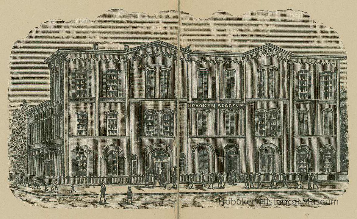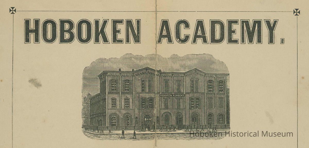 Mounted semi-annual report card of George Ahlert from the Hoboken Academy, June 26, 1896. 8.5" wide x 14" high on 14" x 17" mounting board. Originally folded to 4.25" x 7" it has been mounted with dry mounting tissue at some point.