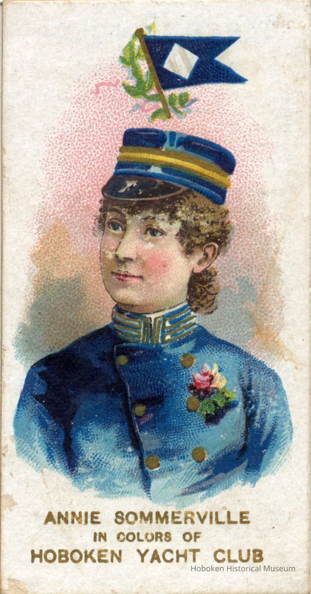 Cigarette advertising card: Annie Sommerville in Colors of Hoboken Yacht Club, issued by W. Duke & Sons, N.Y., 1890.