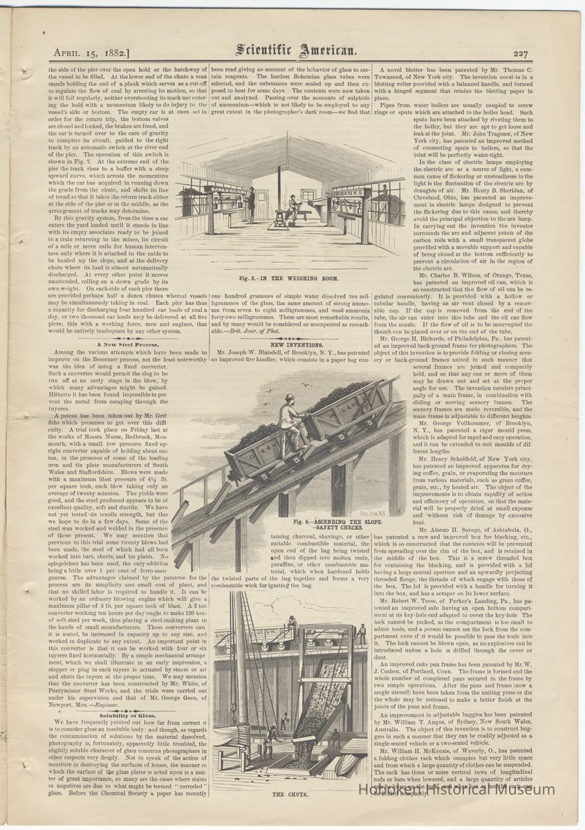 Notes: Scientific American, text on page 226, column 3 and page 227, column 1. APRIL 15, 1882. THE GRAVITY COAL PIERS AT HOBOKEN. Among the peculiar conditions of the enormous traffic in coal carried on at this port there are two which are chiefly instrumental in determining how the work must be done. The quantity of the material delivered in any unit of time is comparatively very great; and the value of the coal, compared in bulk or weight with other commodities, is very small. Hence the necessity of employing broad, cheap, and rapid methods of handling large quantities at once, with the least outlay of mechanical power and manual skill. A typical illustration of the means which have been devised for meeting the larger necessities of this great traffic may be found in the docks and piers of the Delaware, Lackawanna, and Western Railroad Co., at Hoboken. This corporation, as our readers are aware, is one of the half dozen great coal mining and transporting companies of the country. The Eastern or New York terminus of its road lies just south of Ferry street, Hoboken, occupying a large block of the made land which covers what was once a broad shallow bay between the Hoboken ferry landing and the slip of Jersey City ferry. The property outside the old shore line comprises eighty-five acres, and is divided about mid-way by a basin or dock, running back to near the line of the original shore, something over half a mile from the present river front. South of this basin lie the tracks, piers, wharves, and docks used in the coal traffic. A fair idea of the extent of these appliances for the delivery of coal may be obtained from an inspection of the larger illustrations herewith. The method of handling the coal, or, to speak more exactly, of delivering it without handling it, will need perhaps a more extended description. Standing at the point of view of Fig. 2, and looking riverward over the sea of coal cars, some full, some empty; some moving, some at rest; and, whether rolling toward the delivery piers or returning empty, nearly all pursuing their course unattended and for the most part without visible means of propulsion, it is hard to realize that the vast movement is under perfect control, and with all its seeming complication is in reality very simple. A little closer inspection will discover that the grade of all the tracks carrying loaded cars descends slightly toward the river, so that the long trains are, as it were, eagerly pushing riverward for deliverance, urged on by their own gravity. At the further end of the line car after car is seen to leave the press and (still without visible means of propulsion) to climb the steep grade to the top of the elevated pier and then roll forward along the higher level to the point of discharge. We change our point of view to the foot of the slope. Here we find a weighing shed and an engine house, in which is a stationary engine operating a cable system by means of which the cars are hauled one by one up the slope to the top of the pier. The hitching of the car to the cable, and, after weighing, its passage up the slope, are shown in Figs. 3, 4, and 5. We climb to the top of the pier, some sixty feet or so above the water. The pier carries four tracks, two descending at a slight grade toward the river end of the pier; and other two (for the return of empty cars shoreward) descending from the river end toward the original starting point over half a mile inland, the viaducts for return passing at an easy grade far to the rear of the foot of the more steeply ascending slopes. From the top of the ascending slope the pier extends a thousand feet into the Hudson, flanked on both sides by docks, in each of which float a varied fleet of canal boats, barges, schooners, square rigged vessels, and other shipping, receiving coal or waiting their turn to haul alongside the delivering chutes for the reception of a cargo. From forty to fifty vessels find berth room in each of the docks between the five coal wharves, and perhaps as many as in all of them together in the long basin first mentioned. As soon as a place is vacant at one of the chutes the brakes are loosened on three or four cars, and they move forward, as of their own volition, to the openings over the place of discharge, where they are arrested by an application of the brakes. The car has scarcely come to rest before two workmen attack the lock which holds its movable bottom in place. A sharp blow or two upon the fastening, a turn of a wrench, and the halves of the car bottom fall apart like two hinged doors, and the coal drops into the screening box leading to the iron chute which projects at a low angle from the side of the pier over the open hold or the hatchway of the vessel to be filled. At the lower end of the chute a man stands holding the end of a plank which serves as a cut-off to regulate the flow of coal by arresting its motion, so that it will fill regularly, neither overshooting its mark nor entering the hold with a momentum likely to do injury to the vessel's side or bottom. The empty car is at once set in order for the return trip, the bottom valves are closed and locked, the brakes are freed, and the car is turned over to the care of gravity to complete its circuit, guided to the right track by an automatic switch at the river end of the pier. The operation of this switch is shown in Fig. 7. At the extreme end of the pier the track rises to a buffer with a steep upward curve, which arrests the momentum which the car has acquired in running down the grade from the chute, and shifts its line of trend so that it takes the return track either at the side of the pier or in the middle, as the arrangement of tracks may determine. By this gravity system, from the time a car enters the yard loaded until it stands in line with its empty associates ready to be joined to a train returning to the mines, its circuit of a mile or more calls for human intervention only where it is attached to the c