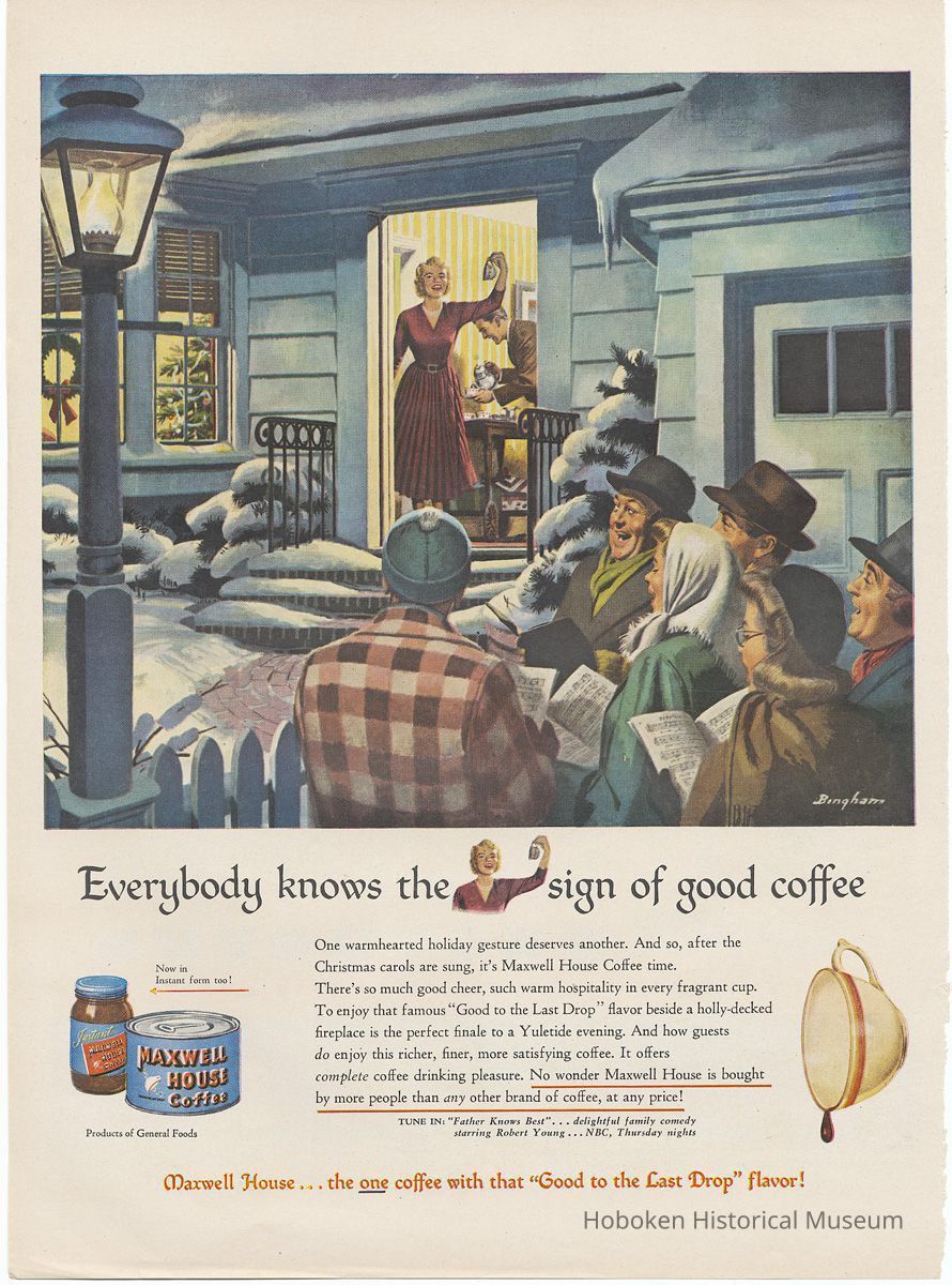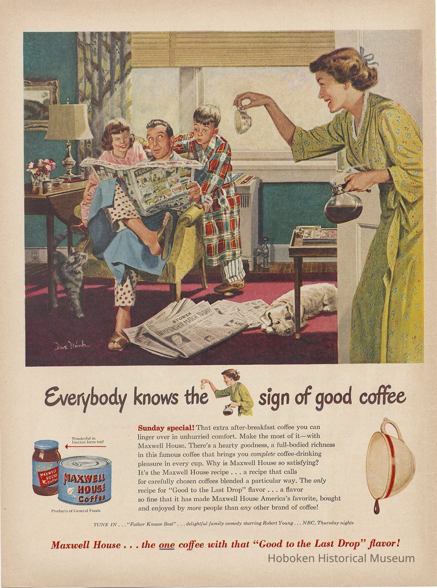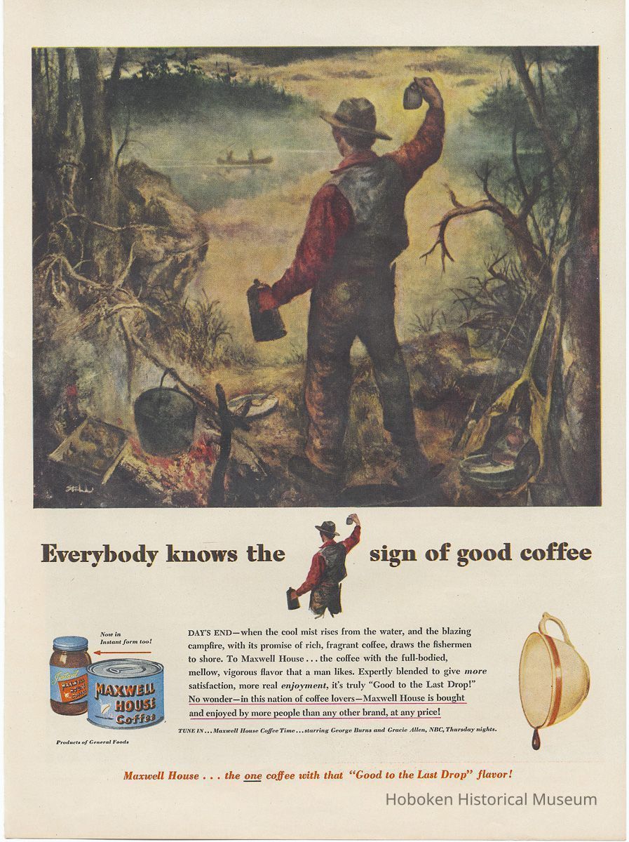 Maxwell House Coffee operated a factory in Hoboken when these ads were published. It was one of four U.S. plants operated by its owner, General Foods Corp., and was at the time the largest coffee processing plant in the world. All but one ad (no. 11) promoted one of the two radio shows that they sponsored in this period: "Maxwell House Coffee Time" starring George Burns and Gracie Allen (Sept. 20, 1945 to June 23, 1949) or "Father Knows Best" starring Robert Young (August 25, 1949 - Nov. 19, 1953).