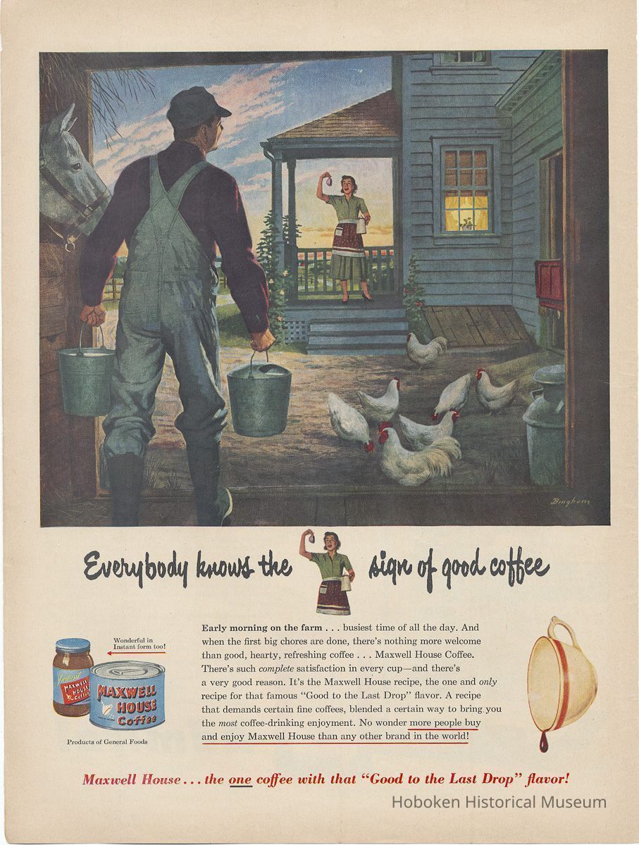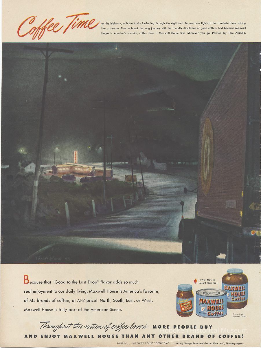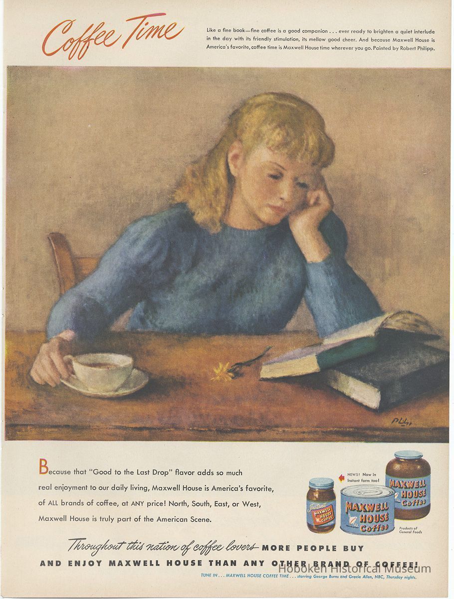 Maxwell House Coffee operated a factory in Hoboken when these ads were published. It was one of four U.S. plants operated by its owner, General Foods Corp., and was at the time the largest coffee processing plant in the world. All but one ad (no. 11) promoted one of the two radio shows that they sponsored in this period: "Maxwell House Coffee Time" starring George Burns and Gracie Allen (Sept. 20, 1945 to June 23, 1949) or "Father Knows Best" starring Robert Young (August 25, 1949 - Nov. 19, 1953).