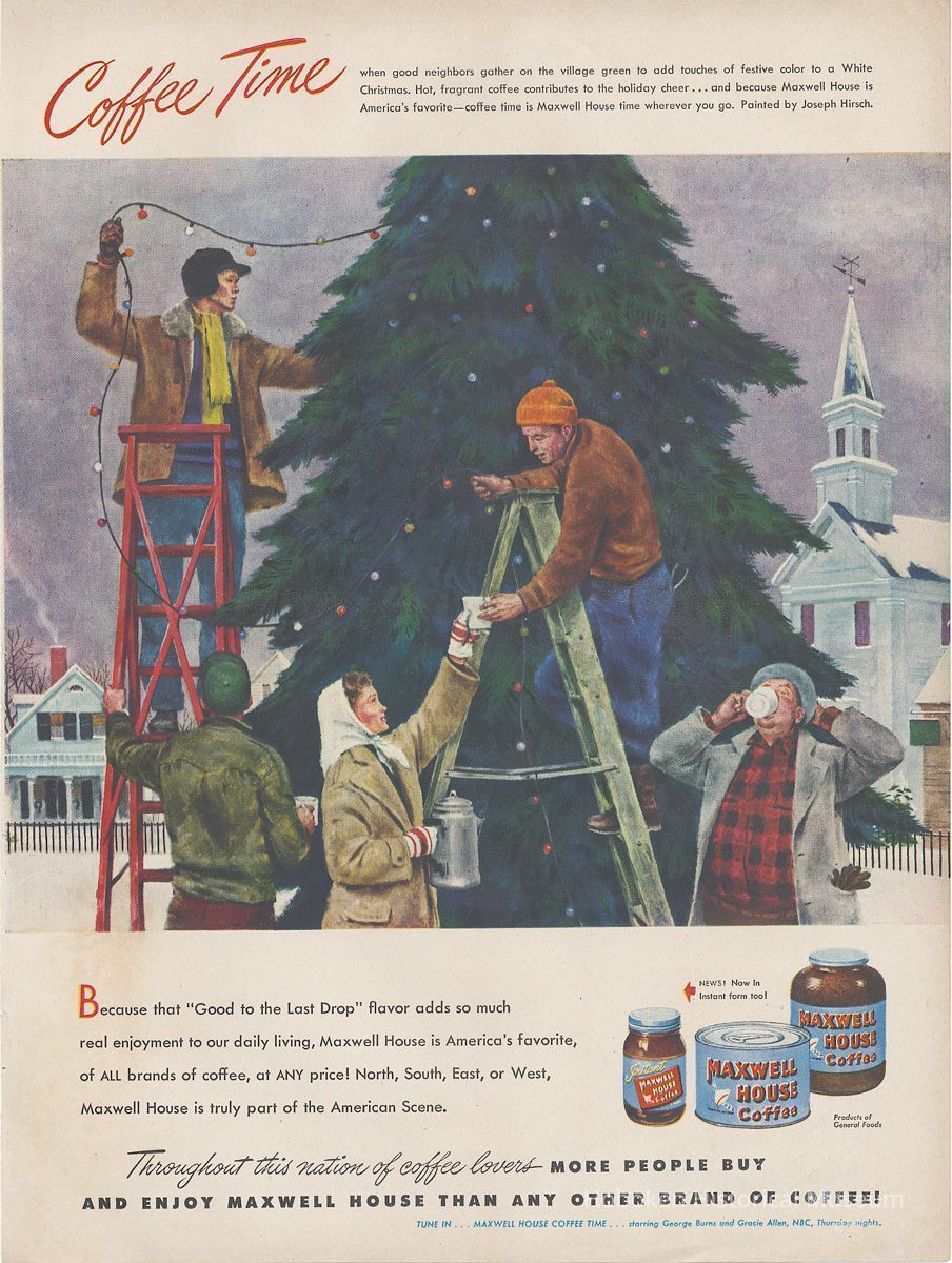 4: [Life Magazine, Dec. 20, 1948, page 38]: "Coffee Time." Illustration: hanging lights on Christmas tree village green; painting by Joseph Hirsch. Products: jar instant coffee ("News! Now in Instant Form too!"), coffee can, clear class jar. "Maxwell House Coffee Time" starring George Burns & Gracie Allen. Reverse, pg [39]: Gibson's Whiskies ad.