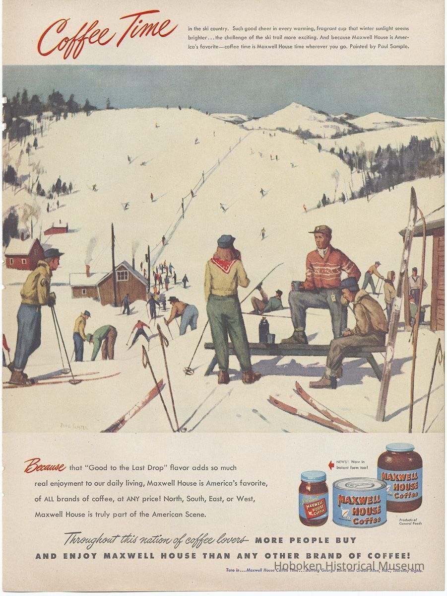 7: [Life Magazine, Jan. 24, 1949, page 65]: "Coffee Time." Illustration: ski slope; painting by Paul Sample. Products: jar instant coffee ("News! Now in Instant Form too!"), coffee can, clear class jar. "Maxwell House Coffee Time" starring George Burns & Gracie Allen. Reverse, pg [66]: American Bakers Association ad.