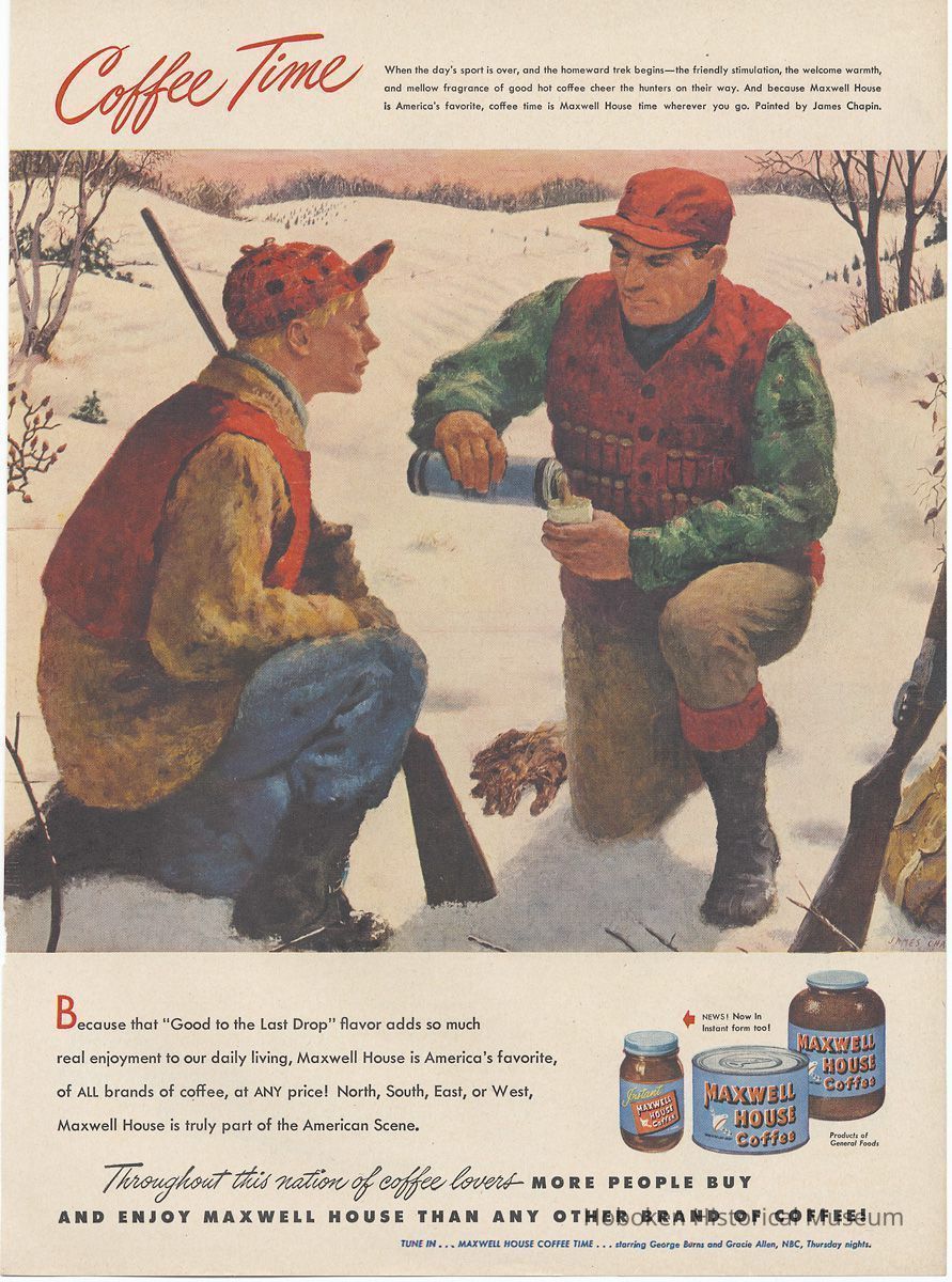 8: [Life Magazine, Nov. 22, 1948, page 67]: "Coffee Time." Illustration: two hunters in snowy filed; painting by James Chapin. Products: jar instant coffee ("News! Now in Instant Form too!"), coffee can, clear class jar. "Maxwell House Coffee Time" starring George Burns & Gracie Allen. Reverse, pg [68]: Englander Airfoam Mattress ad, copyright 1948.