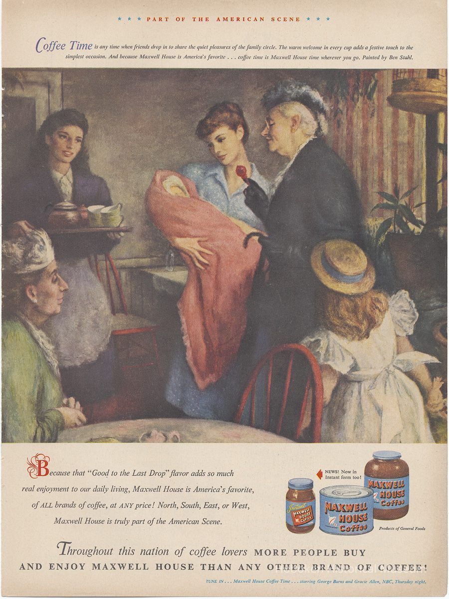 10. [Life Magazine, June 7, 1948, page 101]: "Part of the American Scene." Illustration: women, girl and a baby gathered in a parlor for coffee; painting by Ben Stahl. Products: jar instant coffee ("News! Now in Instant Form too!"), coffee can, clear class jar. "Maxwell House Coffee Time" starring George Burns & Gracie Allen. Reverse, pg [102]: Kimberly Pockette (Pen) by Eversharp ad with Humphrey Bogart.