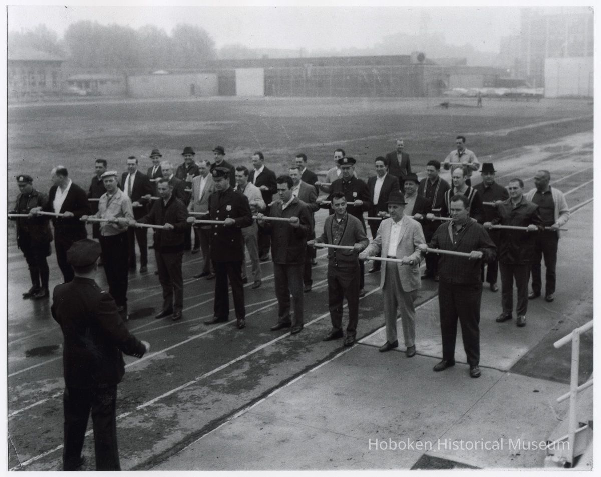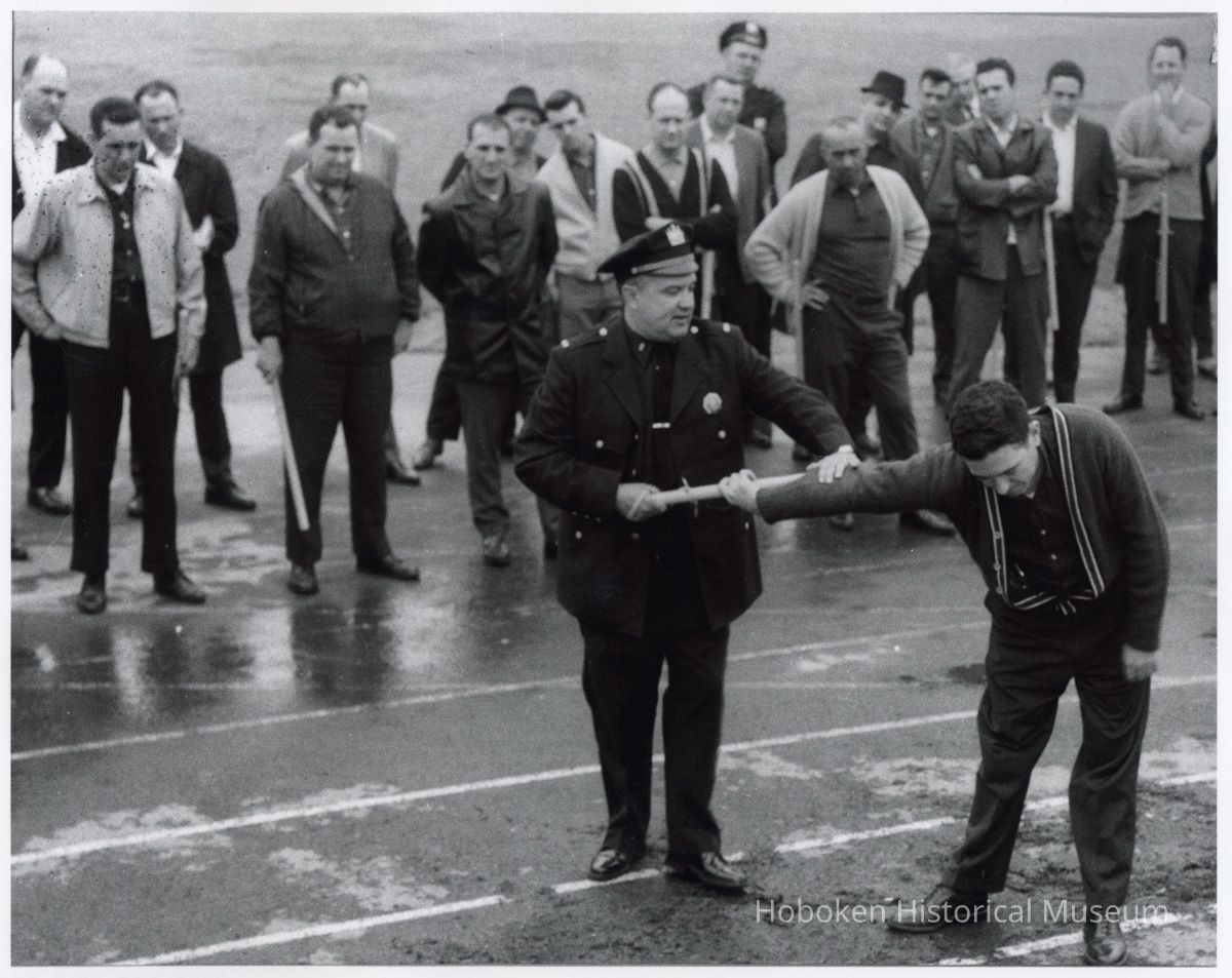Location is the Hoboken High School athletic fields. The officers and civilians are not identified. Event is related to a state of emergency that was declared because of riots in June of 1970 and September of 1971. Which year this image is from has not been established.