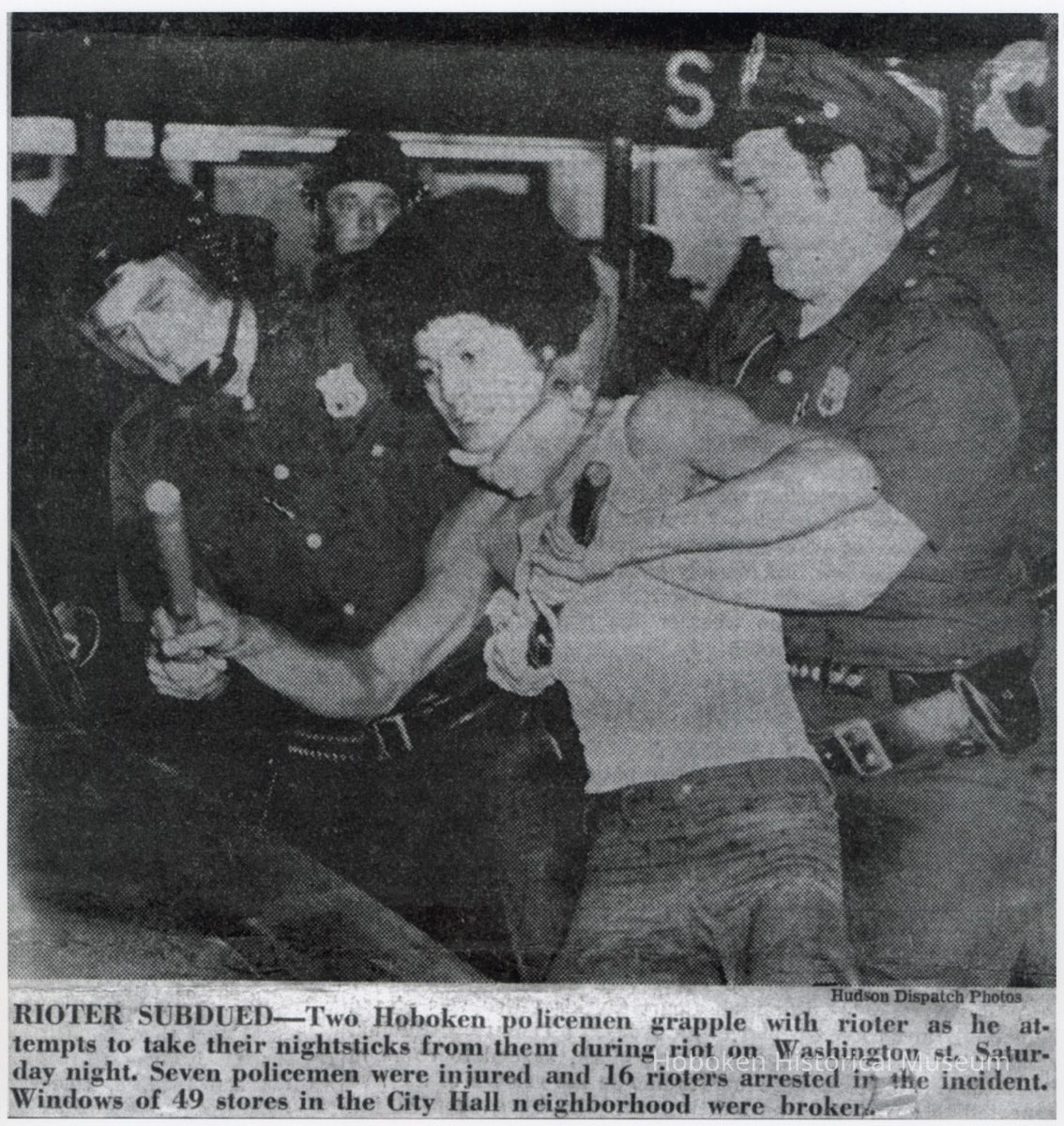 B+W prints of photo of "Rioter Subdued" & article from Hudson Dispatch, Sept. 6, 1971.