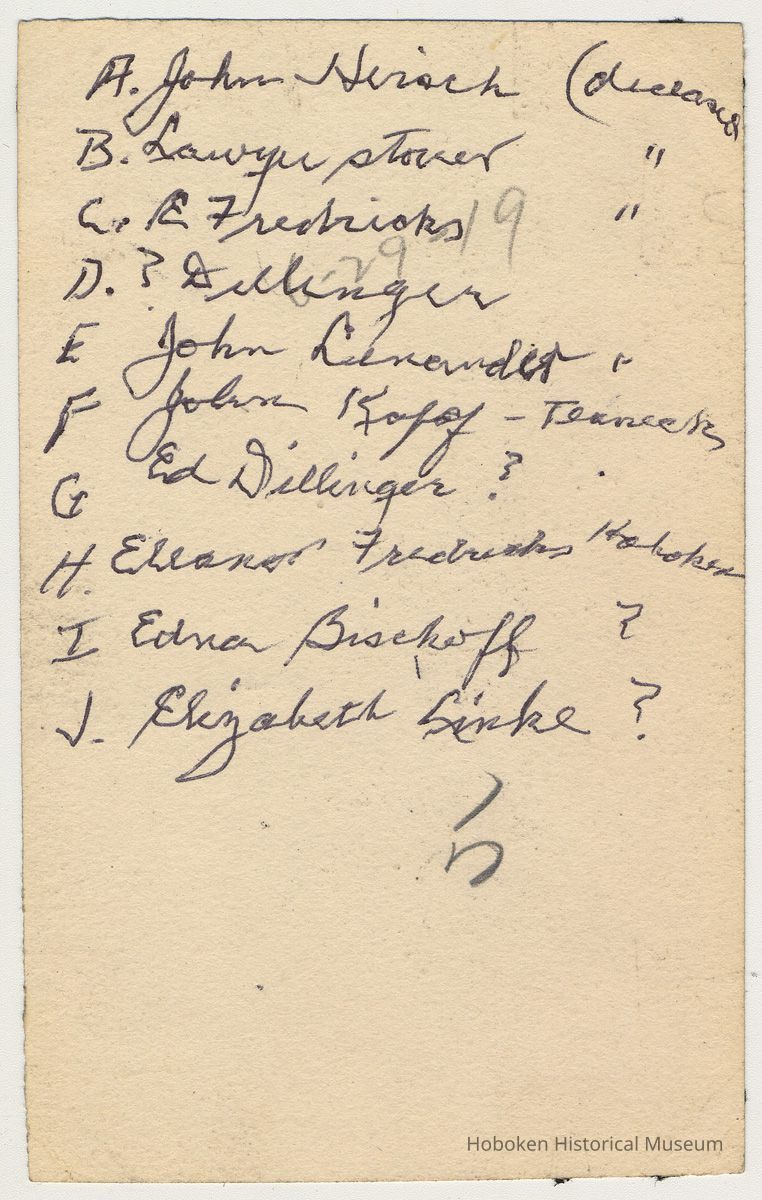 Sepia-tone group photo of people in front of St. Matthew Church, Eighth & Hudson Streets, Hoboken, June 29, 1919. 2-11/16" high x 4-5/16" wide. Photographer not known. Front has modern ink identification key with names on the reverse. Also on back beneath the ink is the date in pencil. Who made the identifications or when (probably later part of 20th century) is unknown, but they are likely to have been by a member of the Stover family of Hoboken.