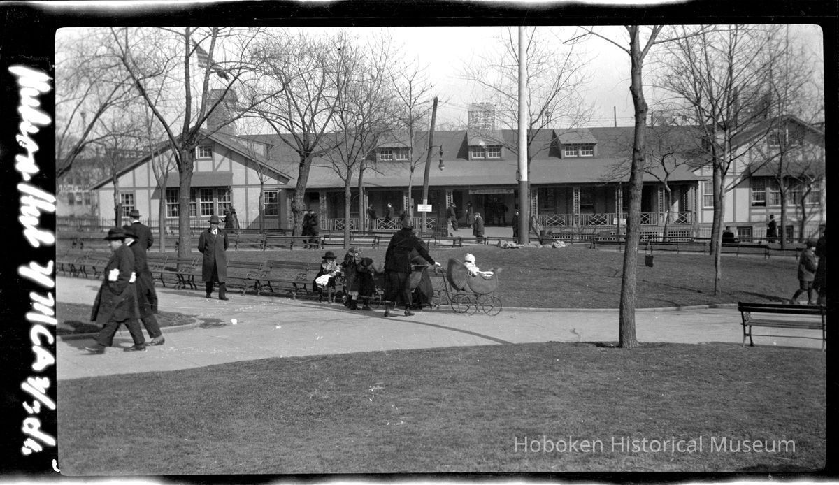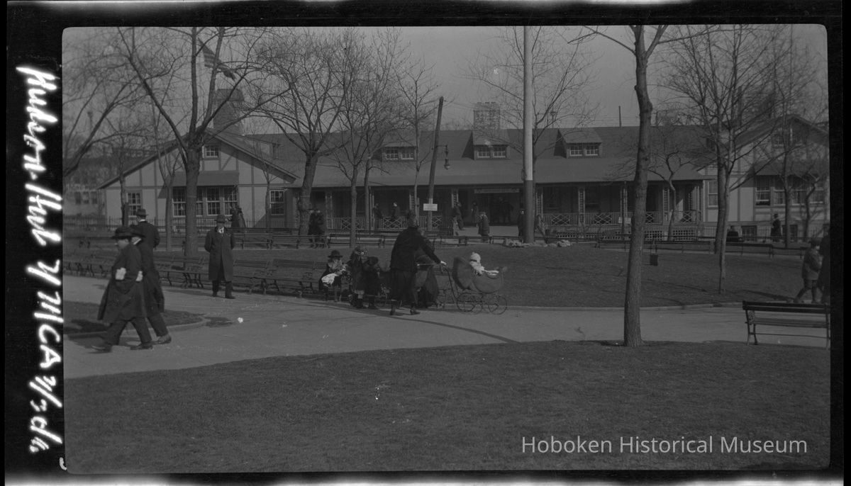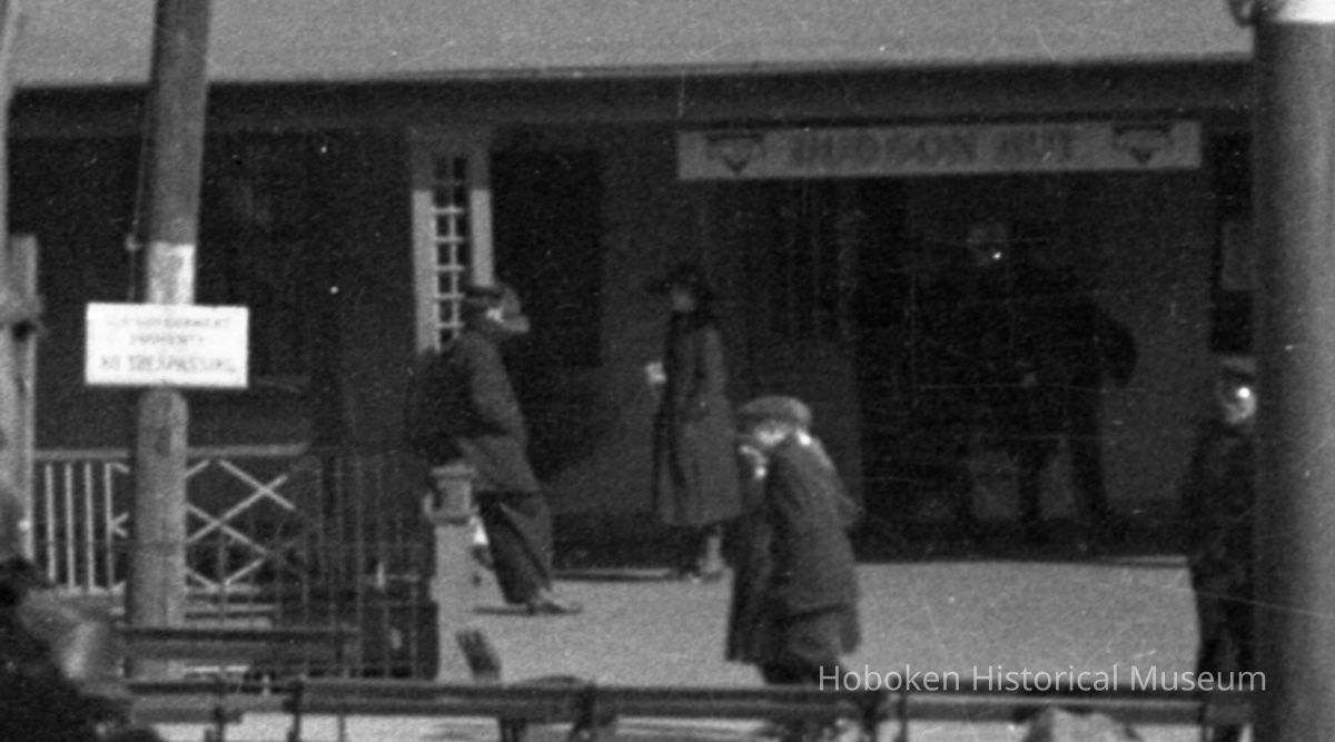 The Hut was for operated for soldiers and sailors involved in the U.S. Army Port of Embarkation and Debarkation duties at the Hoboken piers and at other locations in Hoboken. Note in the detail image showing the sign over the main entrance, "Hudson Hut," there is also lettered sign on the utility pole to the left of the entrance: U.S. Government Property. No Trespassing."