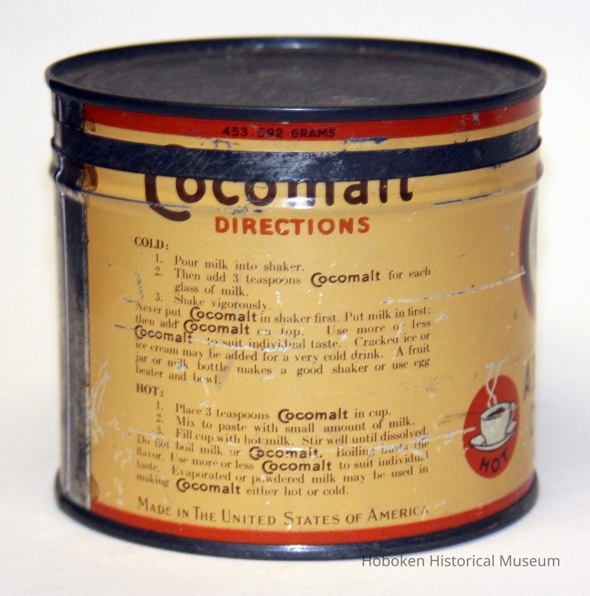 Cocomalt. Malted Food Drink. 1 Pound Net. Made by the R.B. Davis, Company, Hoboken, N.J. No date, circa 1928-1930. Printed (lithographed tin) metal can with lid; original opening strip and church key not present; 4-1/4" diameter x 3-11/16" high. Top has embossed code: F 32.