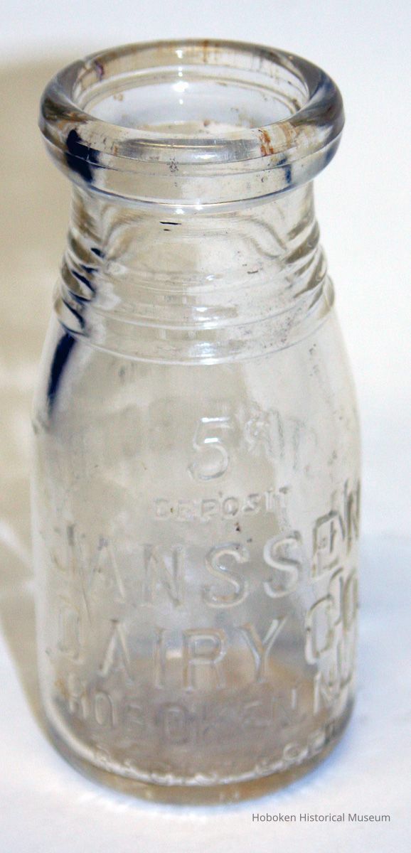 Bottle: Store Bottle; 5 cent deposit; Janssen's Milk; Janssen Dairy Co., Hoboken, N.J. 1/2 pint. No date, circa 1940-1955. Molded clear glass, 2-1/2" diameter x 5-7/16" high. With cardboard cap (not original.) Maker's mark on back.