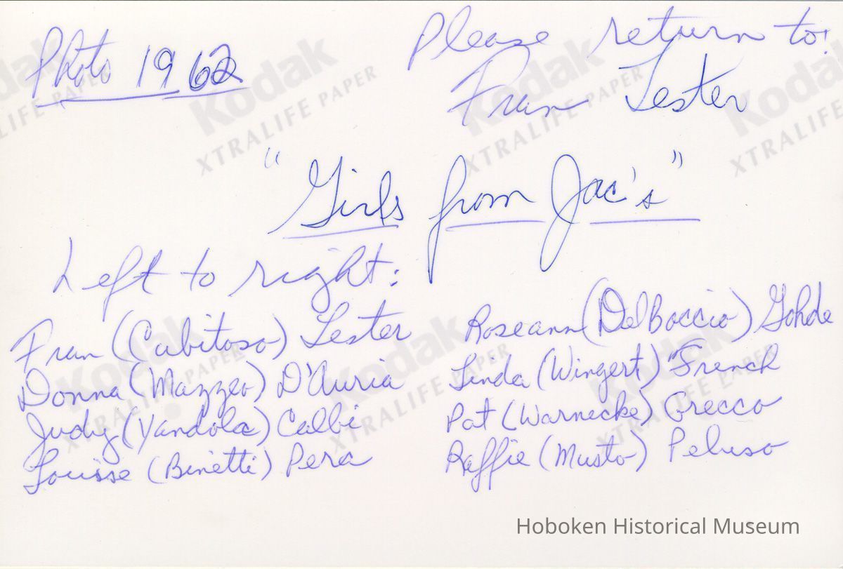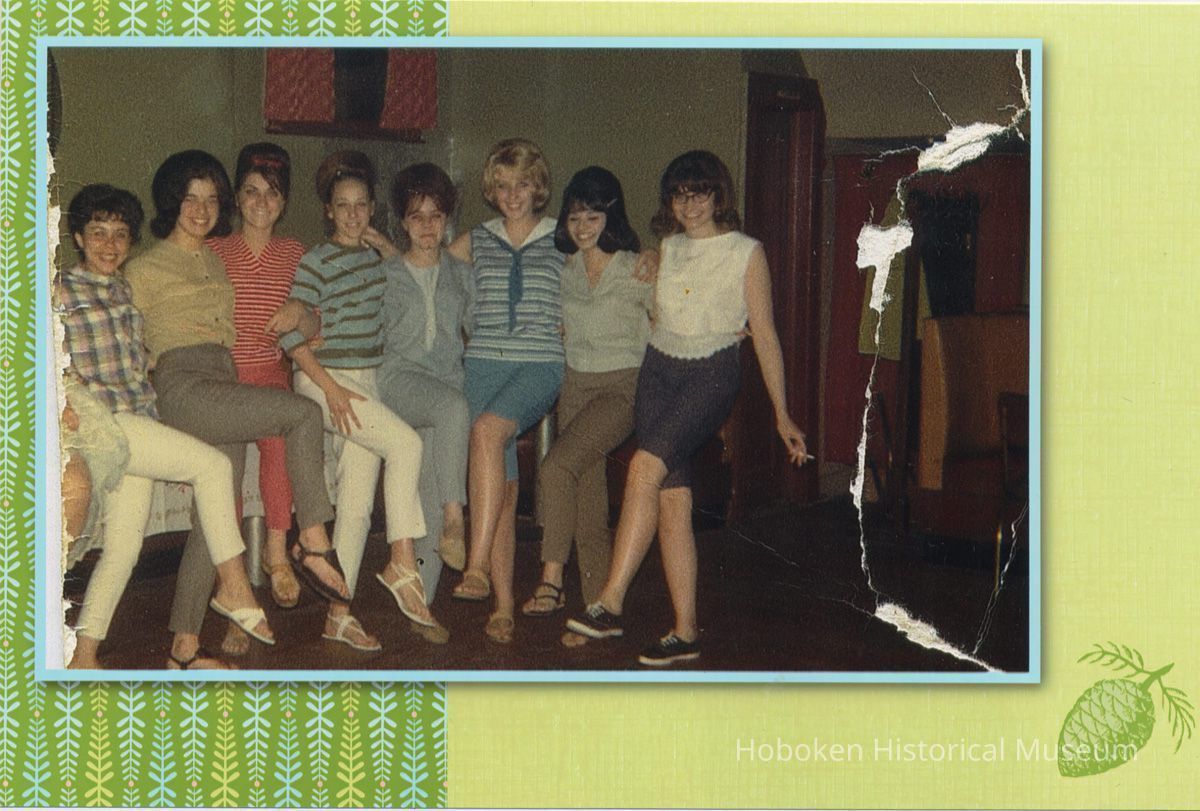 Color photo of eight girls, "Girls from Jac's," Jac-O-Dine Luncheonette, 401 Bloomfield St., Hoboken, circa 1962. Digital image only; original a modern copy print without date. Photographer not indicated. Reverse has modern holographic identifications by the donor.