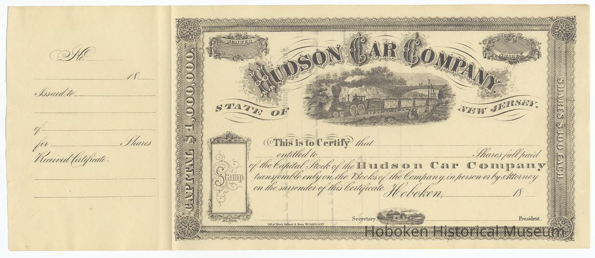 Stock certificate: Hudson Car Company, State of New Jersey, Hoboken, unissued. N.d., not earlier than 1868.