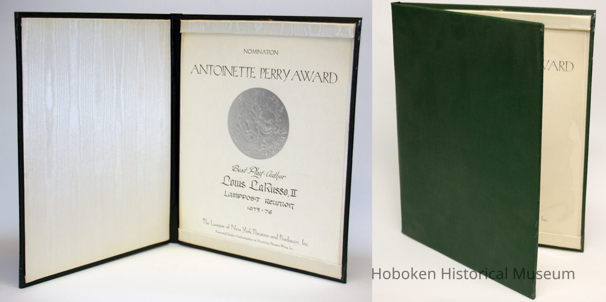 Certificate for Antoinette Perry Award (Tony) nomination, Author of Best Play, 1975-1976, to Louis LaRusso, II, for "Lamppost Reunion", (New York, 1976.) Printed, engrossed and embossed achievement certificate mounted in green cloth hardbound presentation binder with silk lining. Clear vinyl cover sheet. Certificate: 8" wide x 9-1/2" high; binder 8-3/4" wide x 10-1/2" high x 5/8" thick.