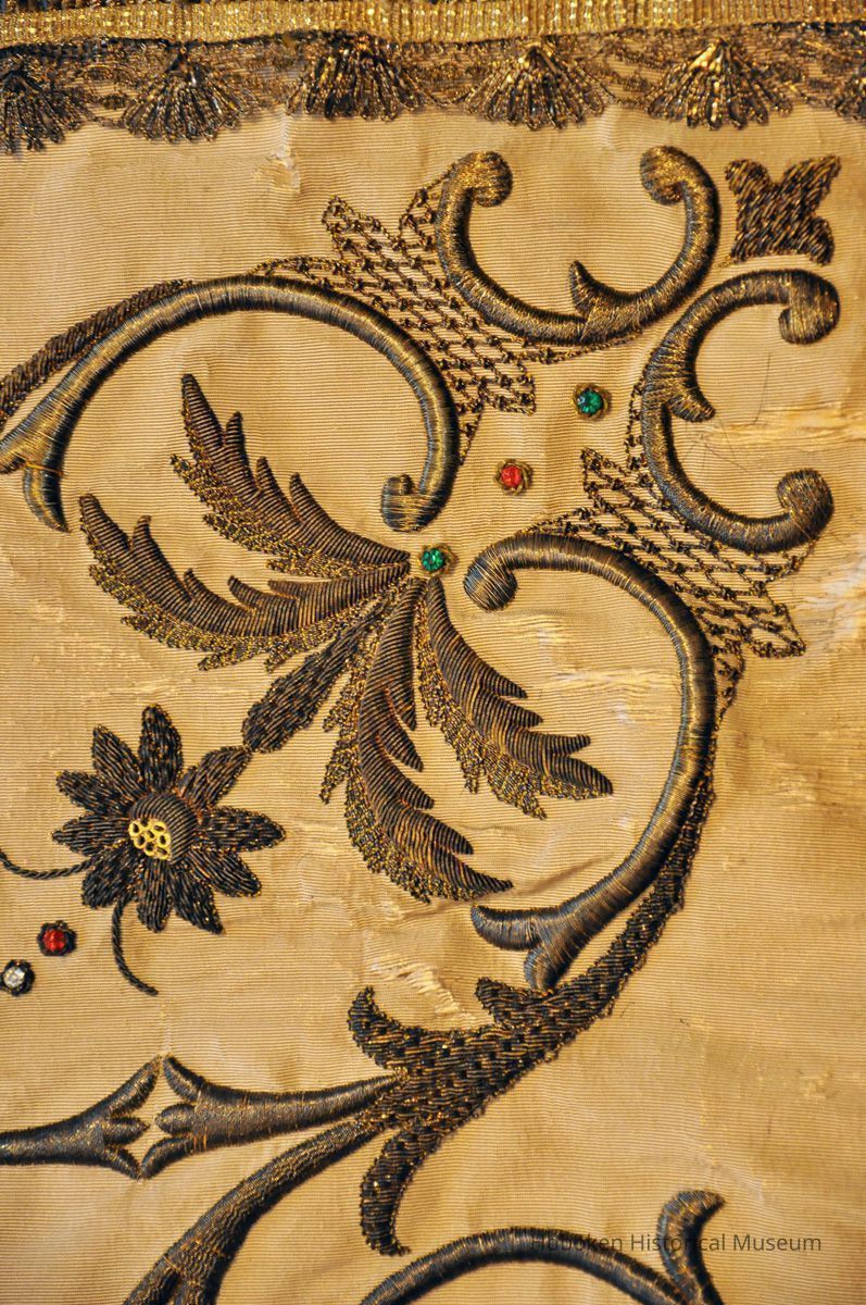 Silk cloth with embroidery/appliques of metal and other threads; metal fringe; rope, ca. 48" x 80" wide.