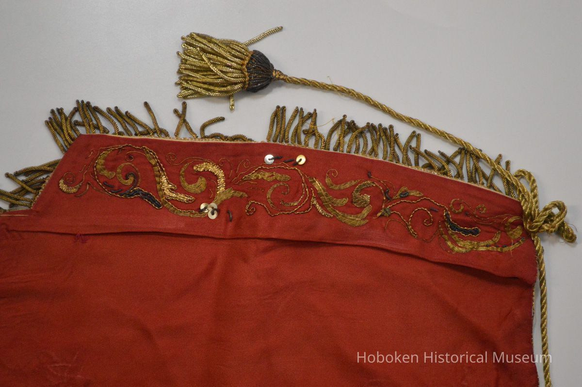 Silk cloth with embroidery/appliques of metal and other threads; metal fringe; rope, ca. 15" wide x 13" high.