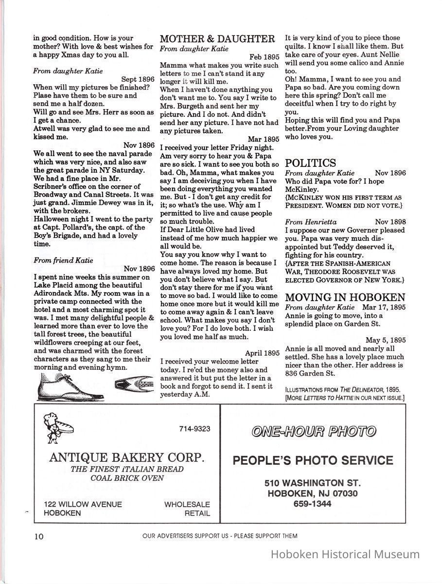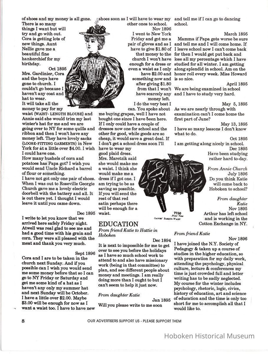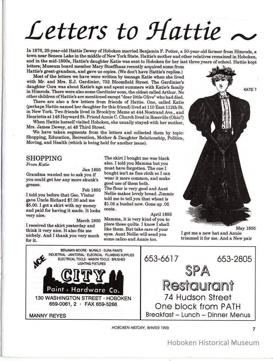Letters to Hattie. Four pages with selected transcriptions of 1895 - 1896 letters Hattie Dewey Potter from daughter Katie Potter plus other correspondents, friends of Hattie's (one also named Katie, who lived in NY.) Daughter Katie wrote from Hoboken when she was here as a teenager for her last three years of school. She lived at 732 Bloomfield Street with Mrs and Mrs. E.J. Gardiner. Her mother, a Hoboken native, was then living in Himrods, N.Y. near Seneca Lake. Hattie's mother, Mrs. James Dewey, lived at 48 Third St., Hoboken.