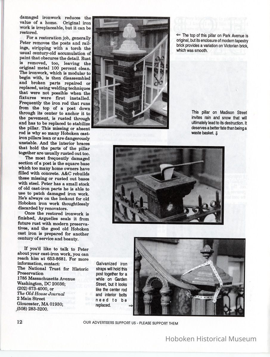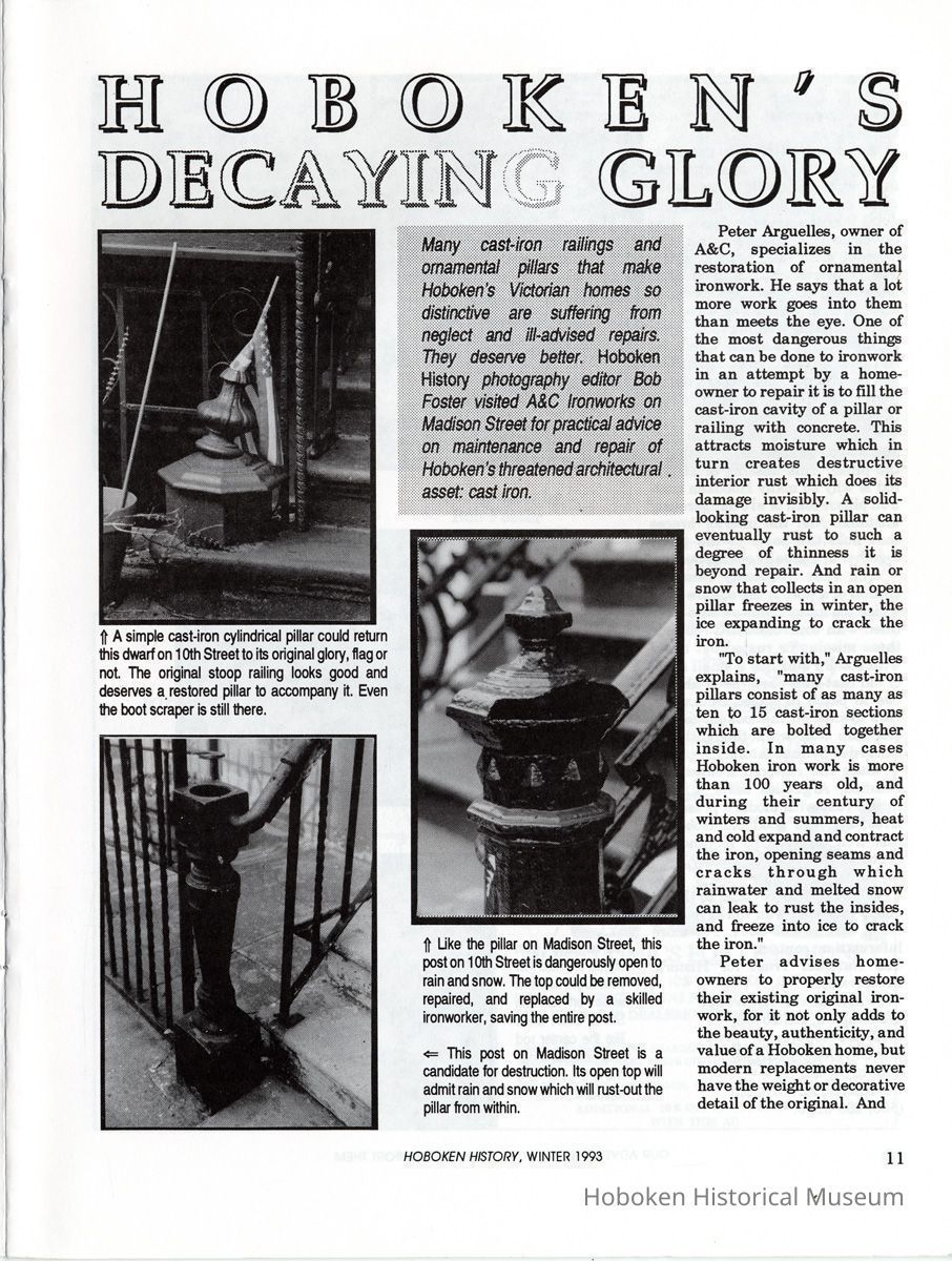 Hoboken's Decaying Glory.Three-page article with eight photos by Robert Foster about the condition of decorative cast-iron railings and ornamental pillars.