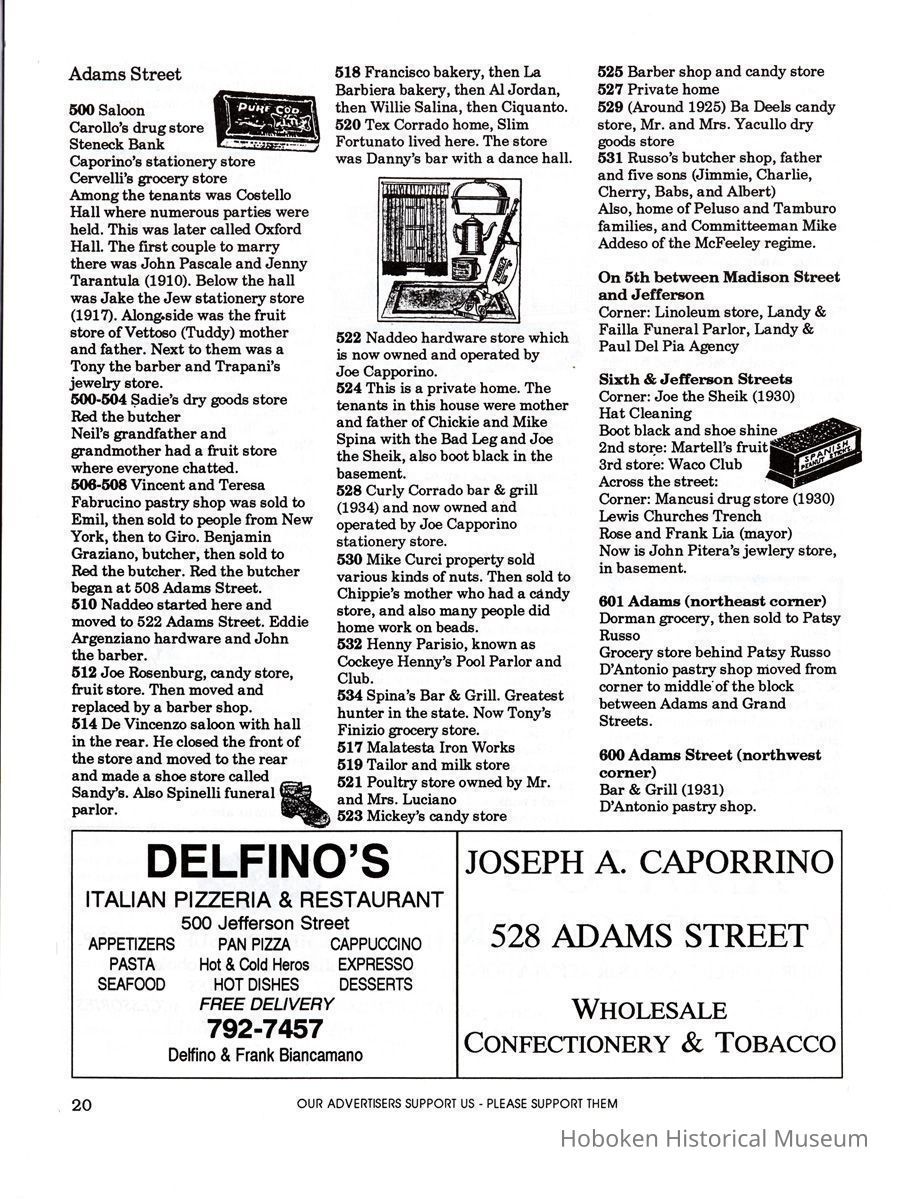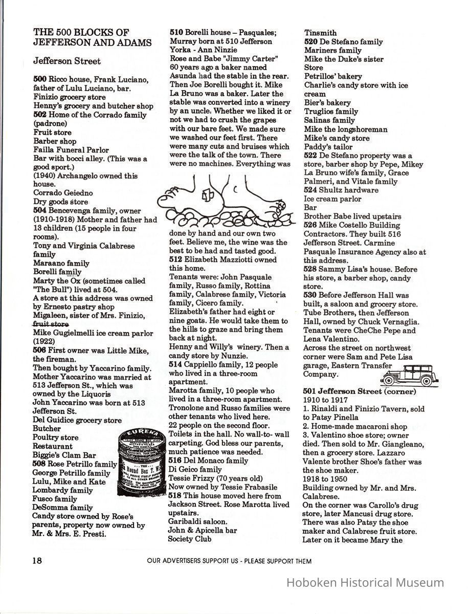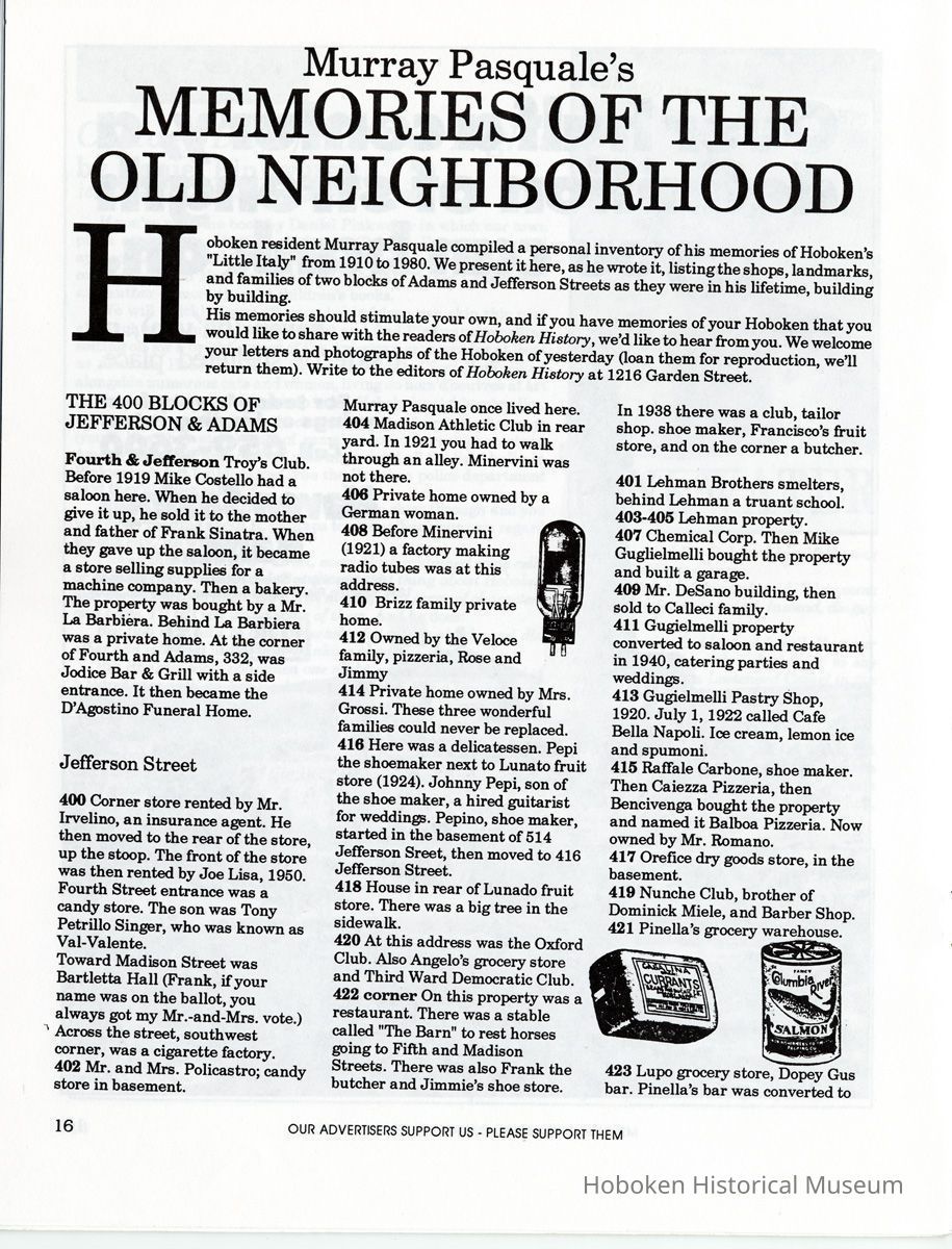 Murray Pasquale's Memories of the Old Neighborhood. Five pages of recollections of Hoboken from 1910-1980 mostly concerning the 400-500 blocks of Jefferson Street or Adams Street in a street-by-street style with building numbers.