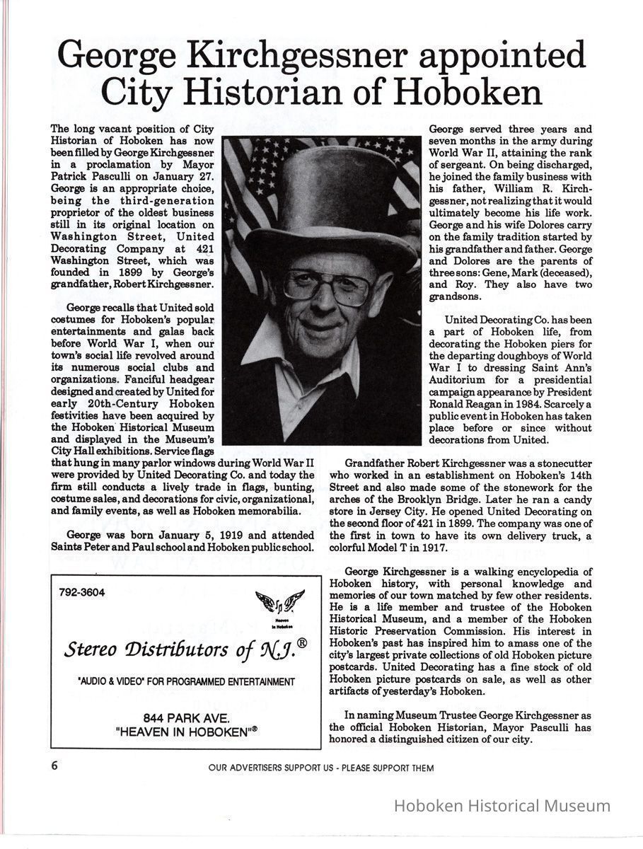 One-page article about appointment of George Kirchengessner as Hoboken City Historian.