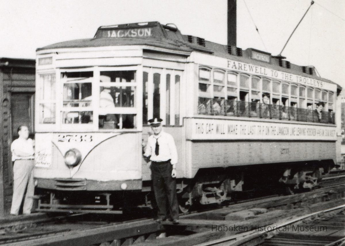 Black-and-white photo of trolley car 2733, Jackson Ave.-Greenville Line, on trestle at Jersey City Heights on last full day of service with signs, Hoboken, August 6, 1949. 3-1/2" high x 5" wide print. Photographer not indicated. Reverse has: processor's mark, J513; typewritten print or negative file number and caption information as below.