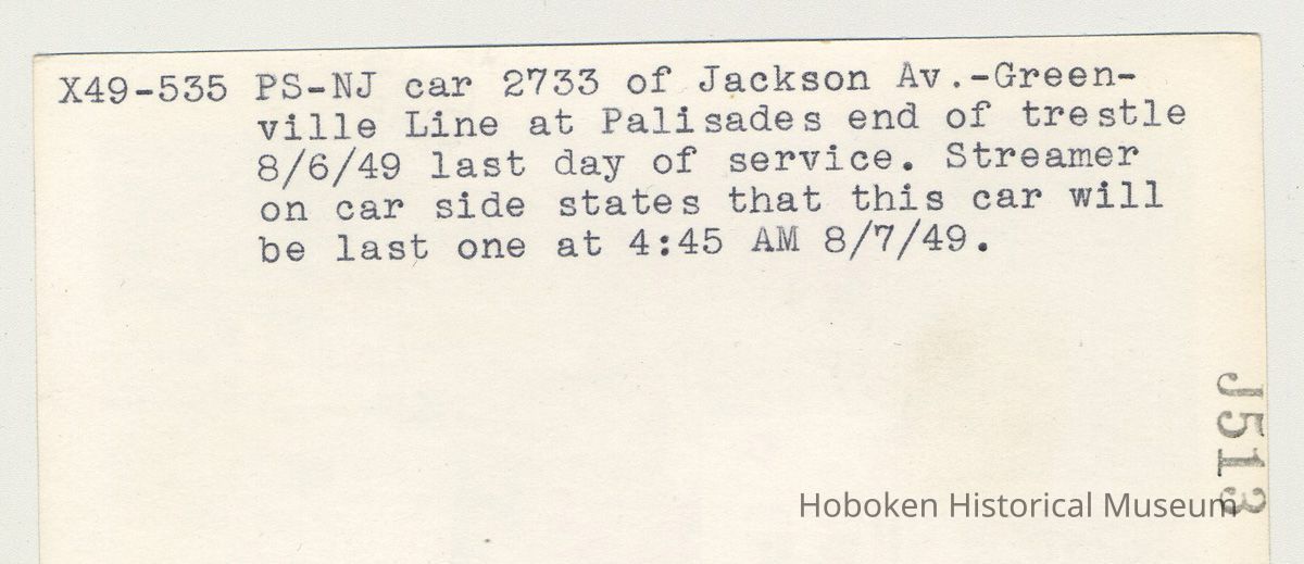 Typewritten on back: X49-535. PS-NJ [Public Service of New Jersey] car 2733 of Jackson Av. - Greenville Line at Palisades end of trestle 8/6/49 last day of service. Streamer on car side states that this car will be last one at 4: 45 AM 8/7/49.
