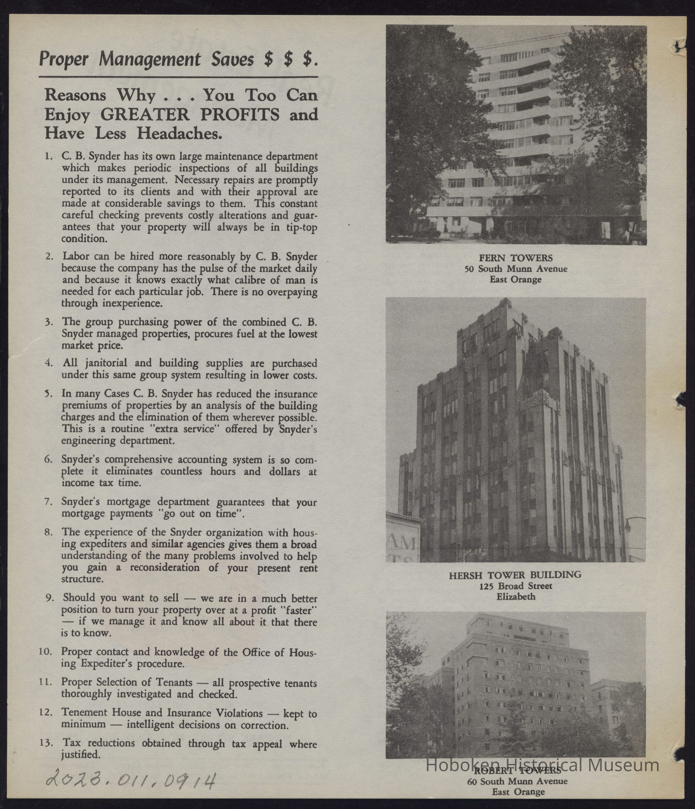 A double-sided black-and-white flier with a color logo entitled "Real Estate Management 'Proven Facts That Spell Profits.'" On the front right side is a photo of a building, the C.B. Snyder Organizations company logo, the main office address, and telephone numbers for affiliated agencies. On the left is a reprinted Hudson Dispatch article dated January 1953 entitled "Professional Management Has Its Advantages." The left side on the back is entitled "Proper Management Saves $ $ $, " followed by a list of thirteen "Reasons Why . . . You Too Can Enjoy GREATER PROFITS and Have Less Headaches." Three photos of buildings are on the right.